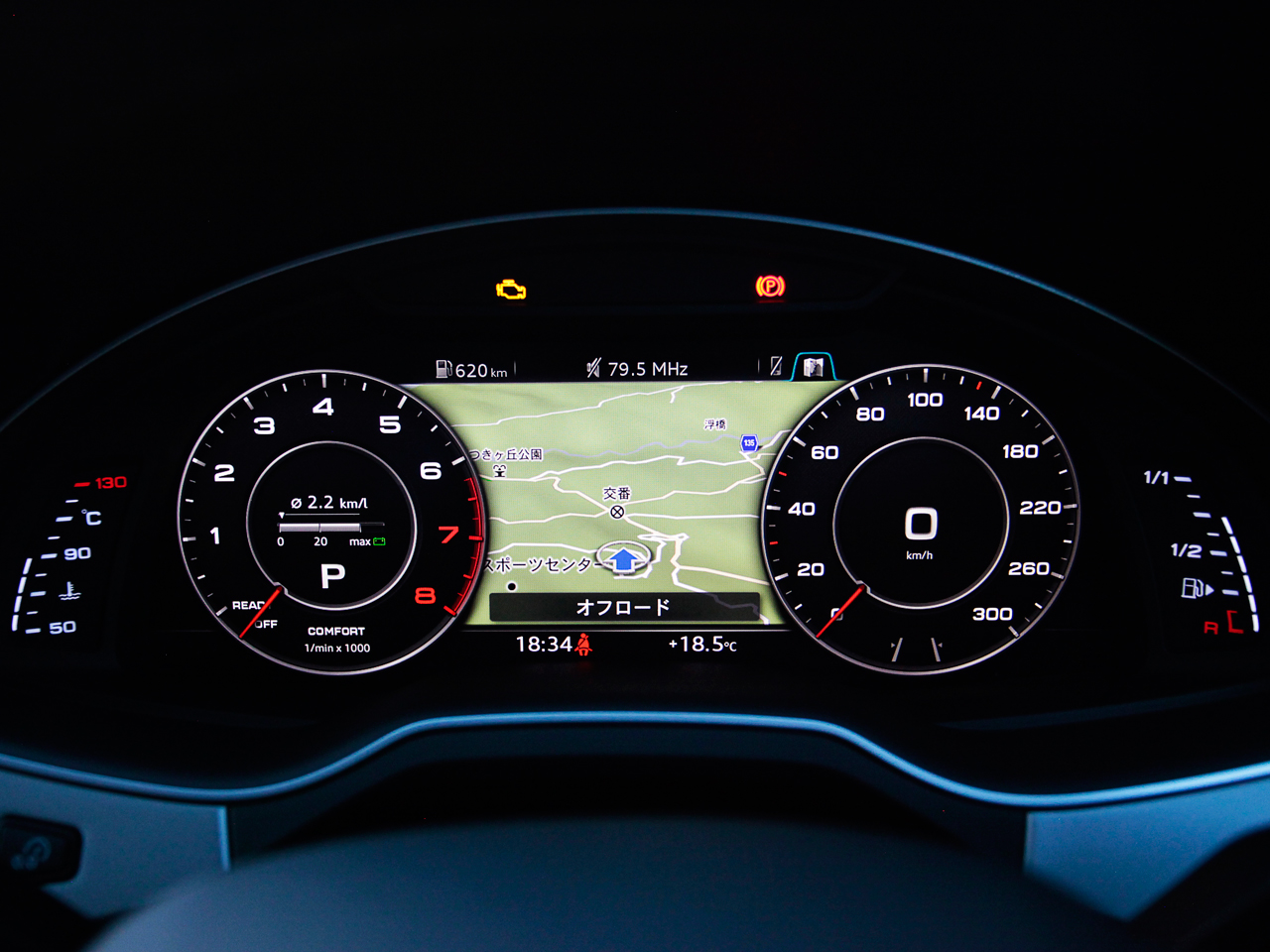 左手をトンネルコンソールに伸ばせば、タッチセンサー付きコントロールパネルを持つ“MMIナビゲーションプラス”を操作でき、一方、目の前、メーターナセル内の12.3インチディスプレイには、スピード&タコメーターに加え、ナビゲーションの地図なども表示されます。