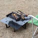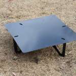他社ブランドのメッシュ火床焚き火台もおおむね一辺40〜50cmなので、まず対応できるでしょう。ただ、「黒皮 焚き火テーブル」は天板に脚が少しだけ飛び出しているので、脚の形状によっては干渉する場合がありそうです。火がついた状態でガタガタするのは危険なので、その場合は使わないように。