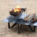 他社製の焚き火台を載せてみました。こちらは36×35cmで周囲に余裕があります。もともと薪がこぼれ落ちにくい形の焚き火台ですが、調味料や食器類を地面に置かずにすむのが助かります。
