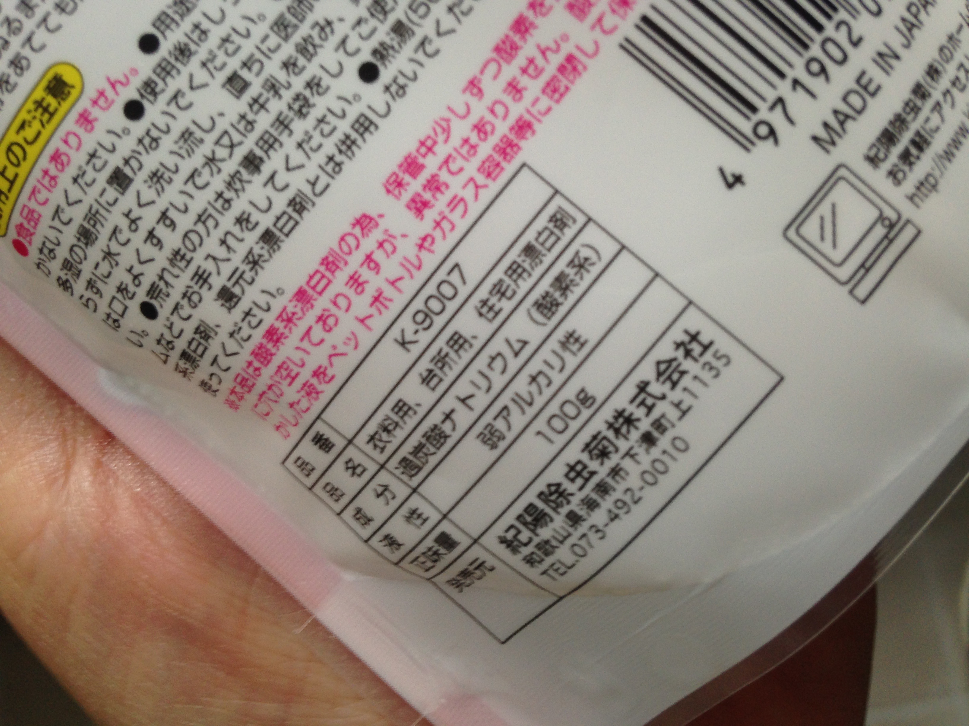 成分欄に「過炭酸ナトリウム」と書かれているのをチェック。100均の酸素系漂白剤には、界面活性剤が配合されているものもあるので注意