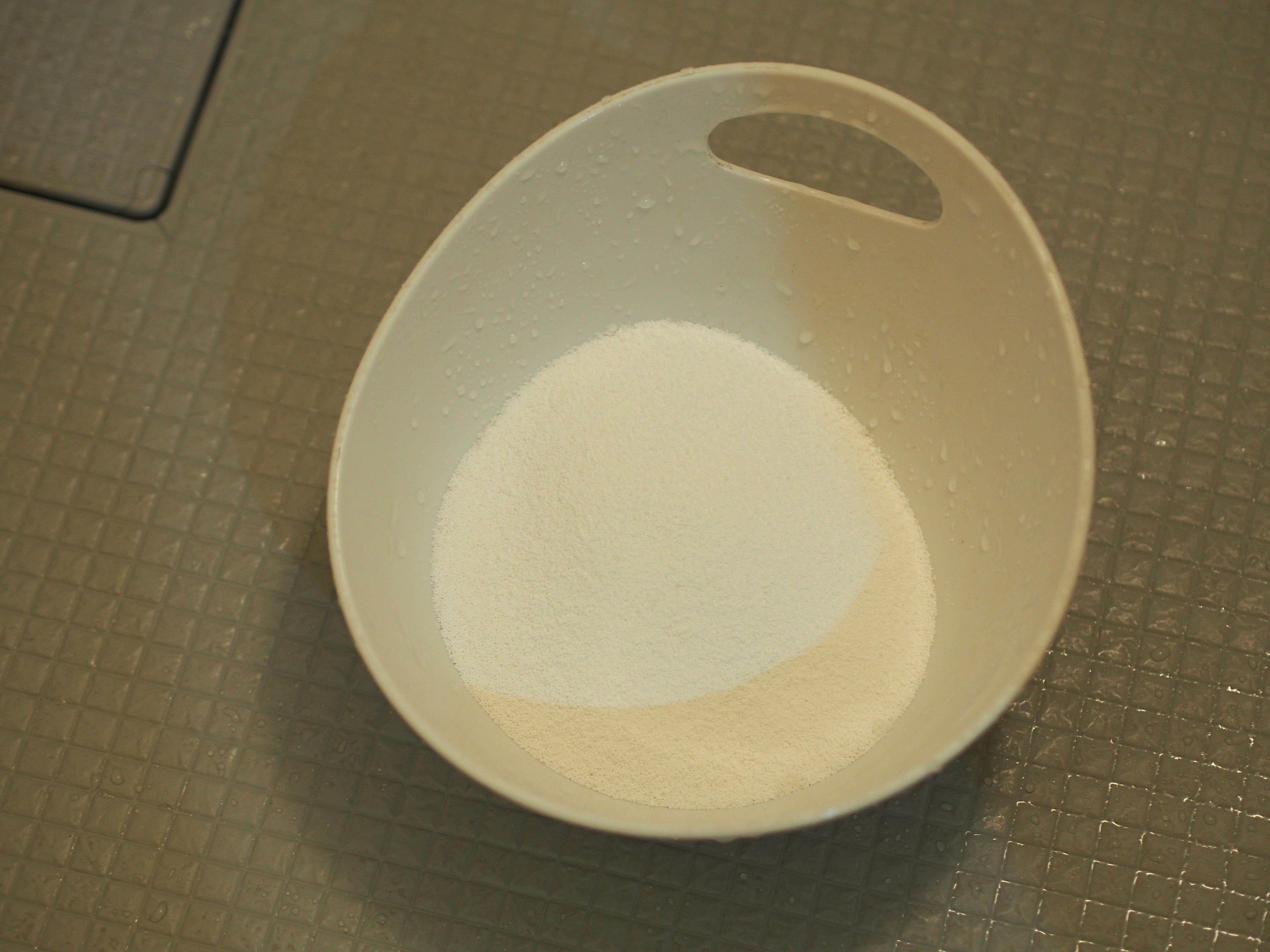 洗面器に酸素系漂白剤を入れて、適量のお湯で溶かしておく。10Lにつき酸素系漂白剤100gが目安。塩素系に比べてツンとしたにおいもなく、手が荒れにくい