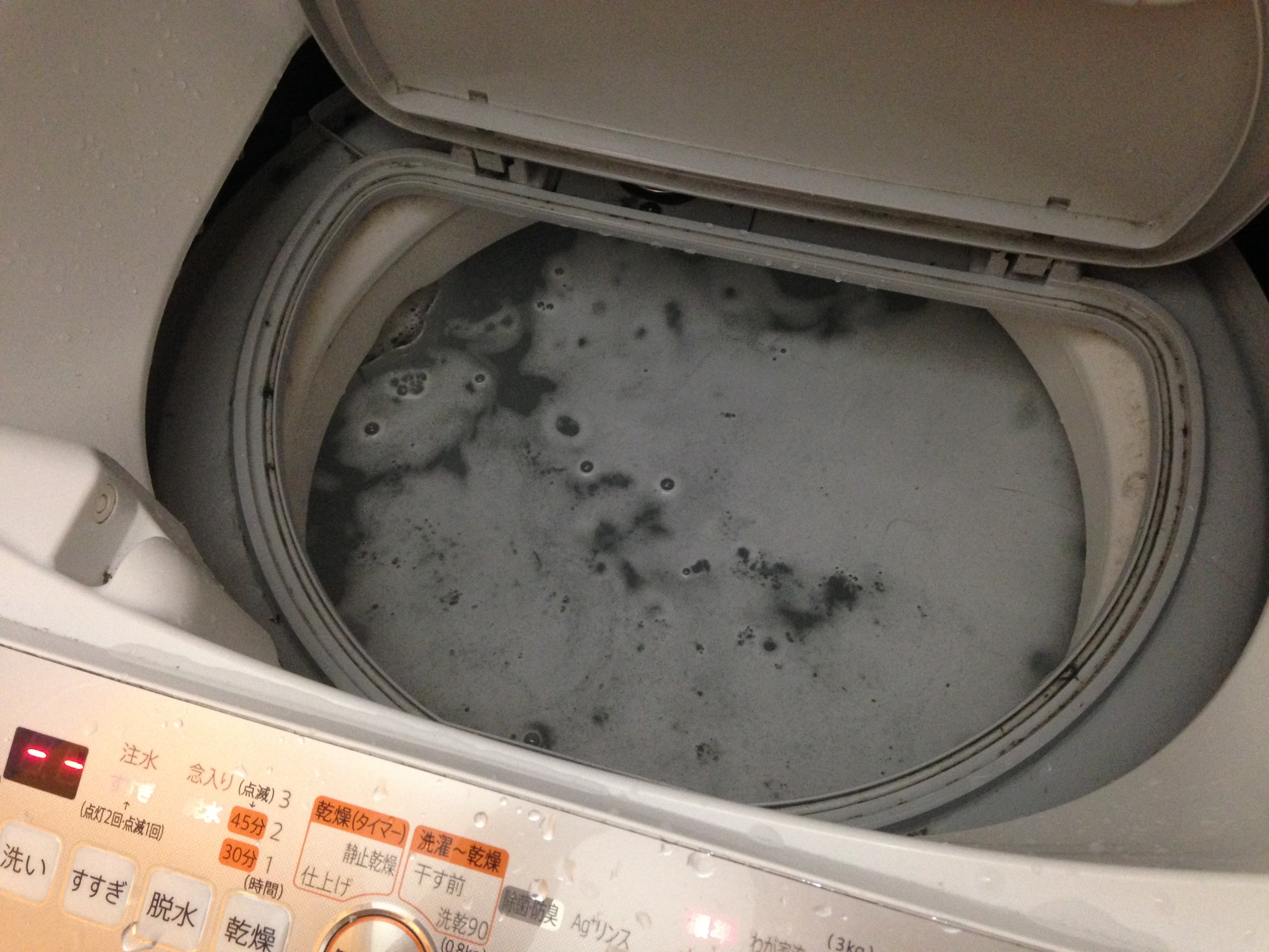 一晩置いて、洗濯機をのぞいてみると、きれいな水のままでした。しかし洗濯機を2〜3回運転させてみると……ぎゃああああ! 出てきました出てきました。水の表面にうっすらと、ホコリやら黒カビやらが浮いています。