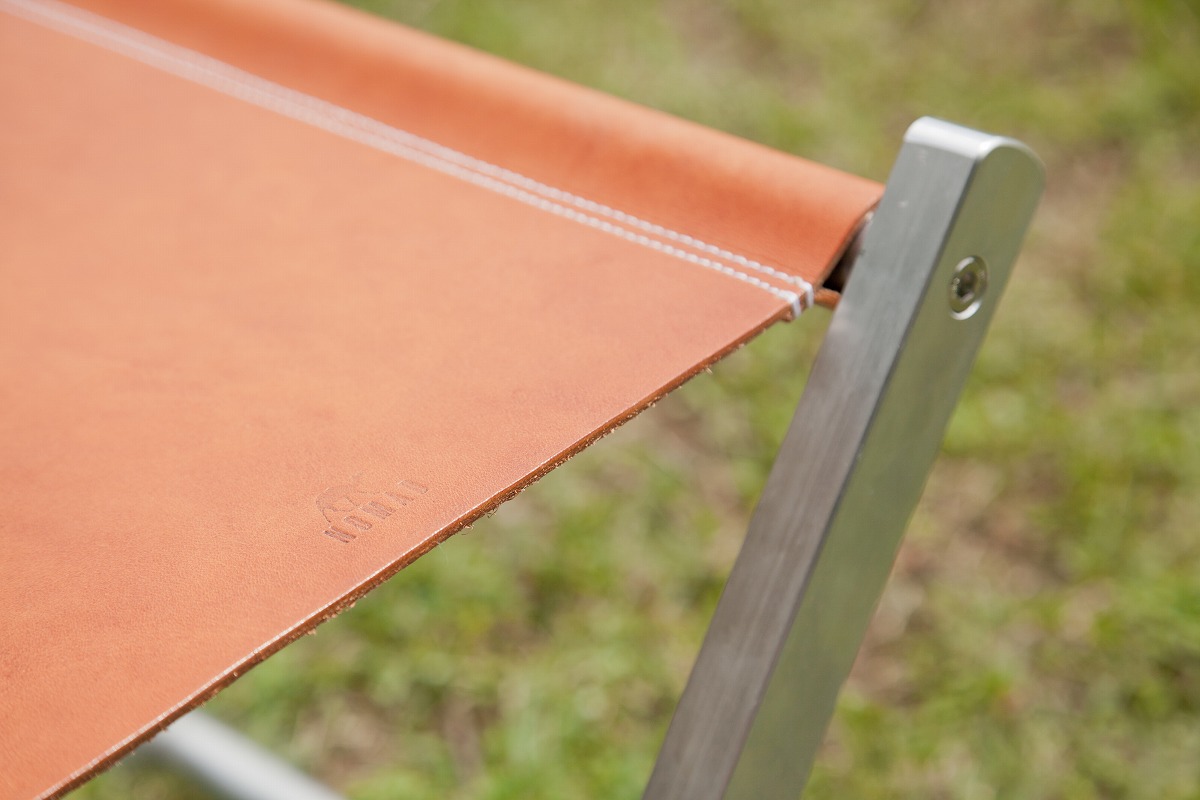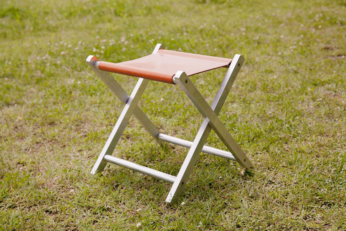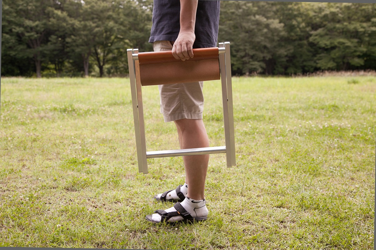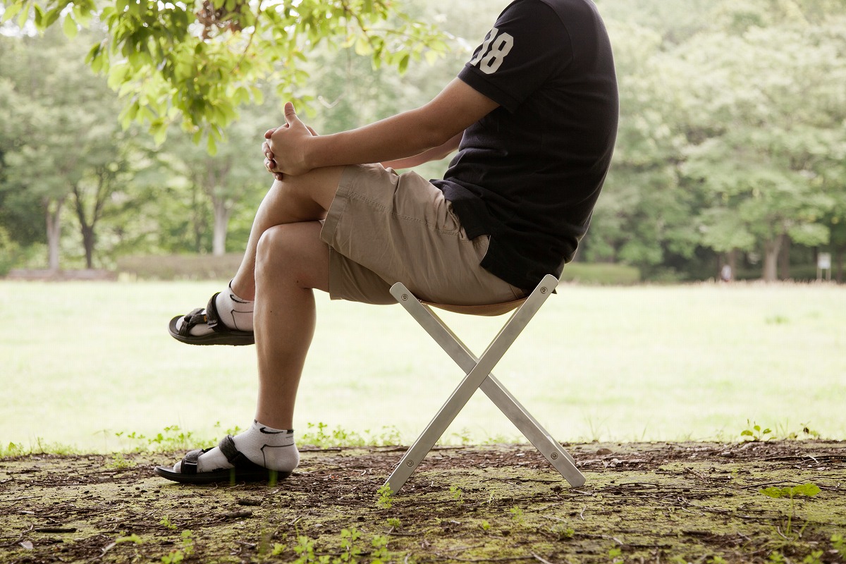 フレームは無垢のアルミ。座面には栃木レザー。それらが、静岡の職人、繁田英樹氏の手によって折り畳みチェアとして昇華される。自宅のリビングに置いても絵になり、高めの座面と高い安定感は実用性も十分。でも、余計な手を加えず素材の良さを引き出したこのチェアは、きっと良く晴れた公園が似合うに違いない。そう思い、畳んで近所の公園に持って行きました。