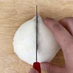 表面が求肥で包まれたスイーツも切ってみたのですが、こちらもチーズと同じく、床に垂直に刃を落とす切り方が向いています。小刻みに切っていくとベタベタした生地が刃についてきてしまい、中身のスポンジ・クリーム・イチゴを覆う餅がずれ、刃がうまく入らず。