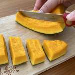 切れ味が鋭く、ほぼなんでもスムーズにカットできることが判明したこのナイフ。最後は芯まで硬く切れ味が試されるカボチャにトライ。表面に刃を入れるためナイフを前後に動かすと、生のカボチャにもスムーズに刃が入りました。