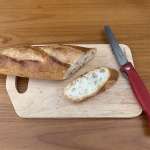 今度はパンをきってみました。まずはハード系のバゲットから挑戦。やはり硬く、最初が切り込みが入るまで数回ギコギコする必要がありましたが、パン切り包丁のように、硬い断面に切り込みを入れられる波刃なので、自宅にある直刃の家庭用包丁よりスムーズに切れました。少し切りかすが出ましたが、ガリガリした部分も崩れることなくクリア。