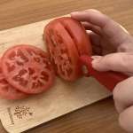 まずは切れ味を試す定番のトマトから挑戦。トマトは外側が硬く、内側が柔らかいので、切れ味が悪いナイフだと潰れてしまいます。さっそく試してみると、さすが「トマト・ベジタブル フォールディングナイフ」なだけある。力を入れずにスッと刃が入ったうえに、波刃なのに皮がギザギザになることもありませんでした。