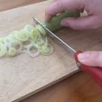次は切れ味が悪いと完全に切れずにつながってしまいがちなネギ。切れ味は鋭いのですが、連続でテンポよく切るものは、少しまな板との相性が悪いかもしれません。下が波刃であるがゆえに、まな板にひっかかってしまうのです。対象物への切れ味は鋭いのに、この理由でうまく連続して切れないのは意外な気付きでした。