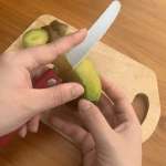きっと薄く切るのも問題ないはずと早速完熟キウイを切ってみると、やっぱりスルッと刃が入りました! 熟してしなった皮は剥きづらく、切れない刃だと途中で皮にシワがより引っかかって綺麗に切れません。しかし、そんな問題もなく、刃をスライドさせて皮をむいても綺麗な形をキープ。鋭い切れ味を再確認できました。