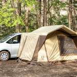 同社「オーナーロッジ タイプ52R」が310×260×H210cmなので、「カーサイドロッジ」はほぼ同じサイズ感。接続したクルマのサイドドアを閉めていると異素材ゆえに圧迫感を感じますが、開けっぱなしにすることで物理的にも心理的にもゆとりが生まれます。
