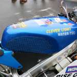 レギュレーションの関係で、選んだのは1989年式のNSR。それもレースベース車として開発された“RK”のフレームを使い、エンジンにはレーサーRS250のシリンダーを使うなど“本気”のカスタムがほどこされています。2ストで性能のキモとなるチャンバーもRS250用。スイングアームは1990年以降のNSR(MC21)用の湾曲したガルアームを使ってチャンバーの容積を稼いでいます。