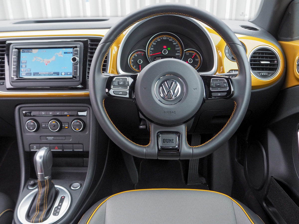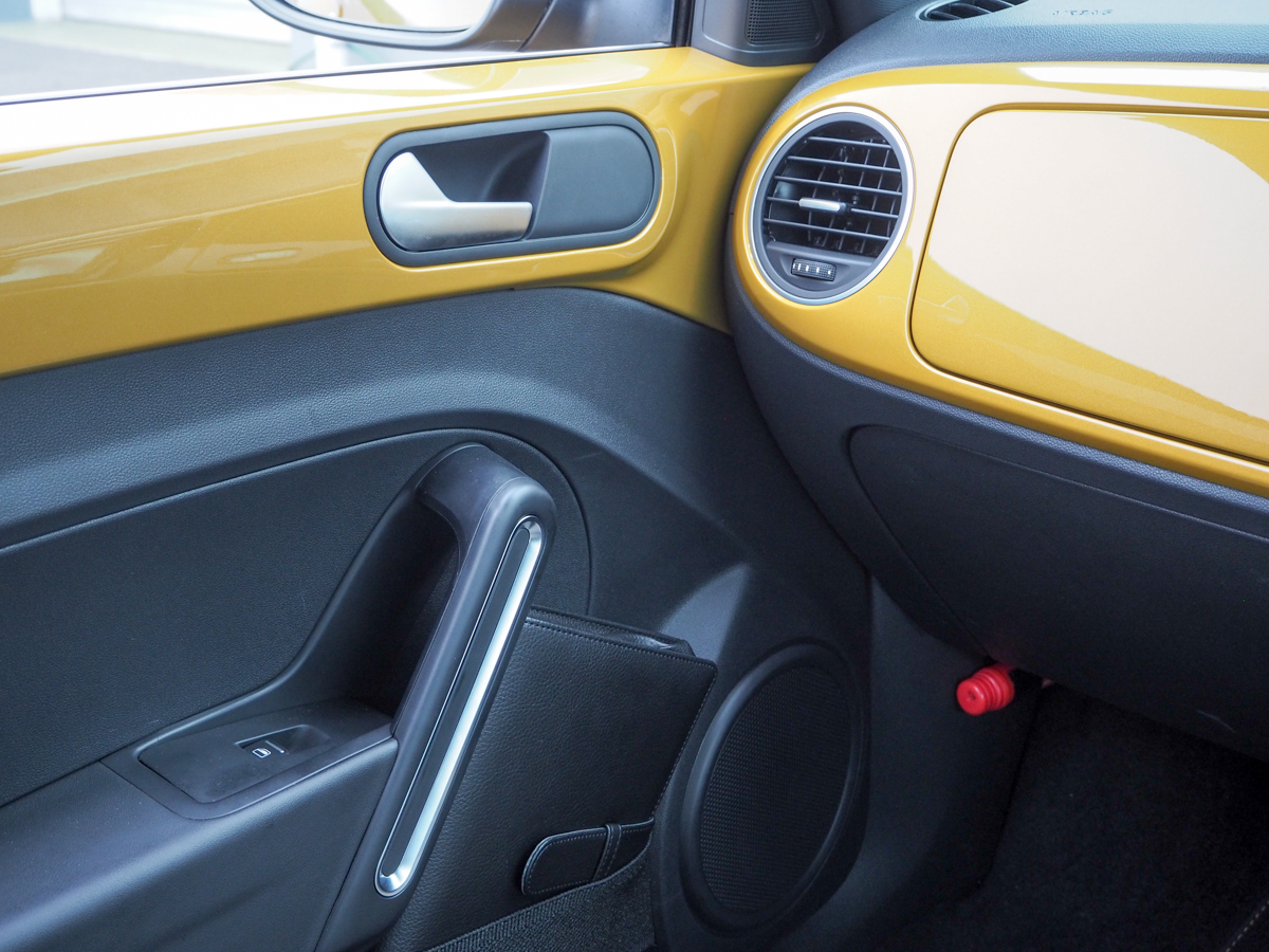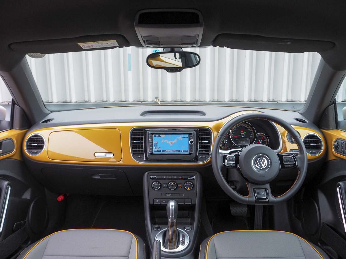 ドアを開けると、インテリアも明るいですね。インパネにボディ同色のパネルが貼られるのは、ベースモデルである「ザ・ビートル」と同じですが、限定色であるサンドストームメタリックがグッド! いやぁ、イエロー系の内装、見たことあります?