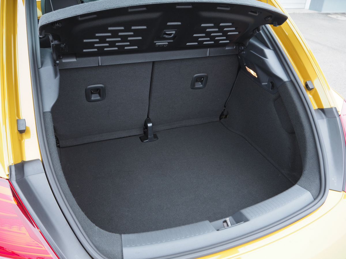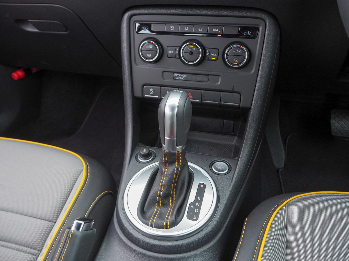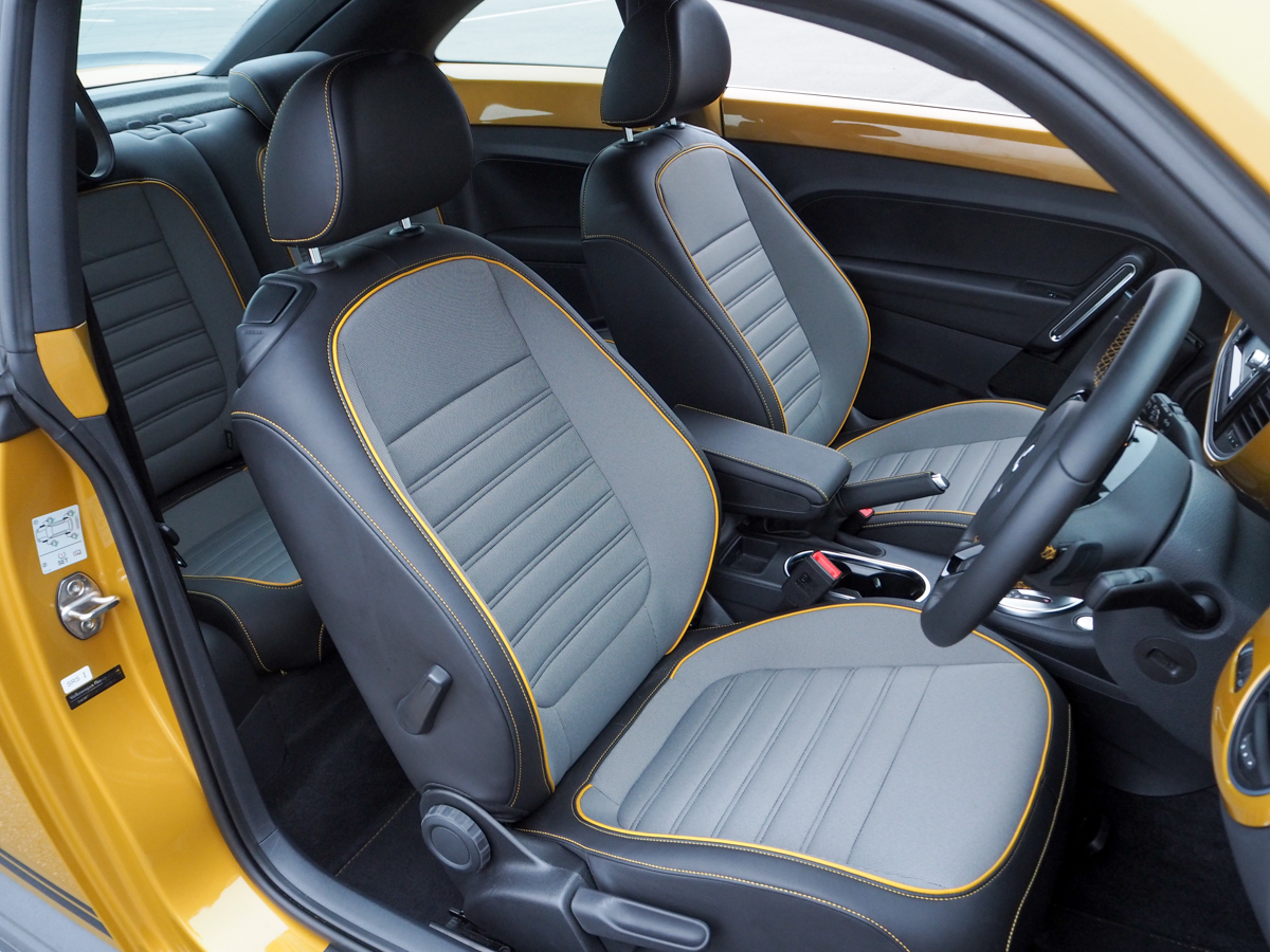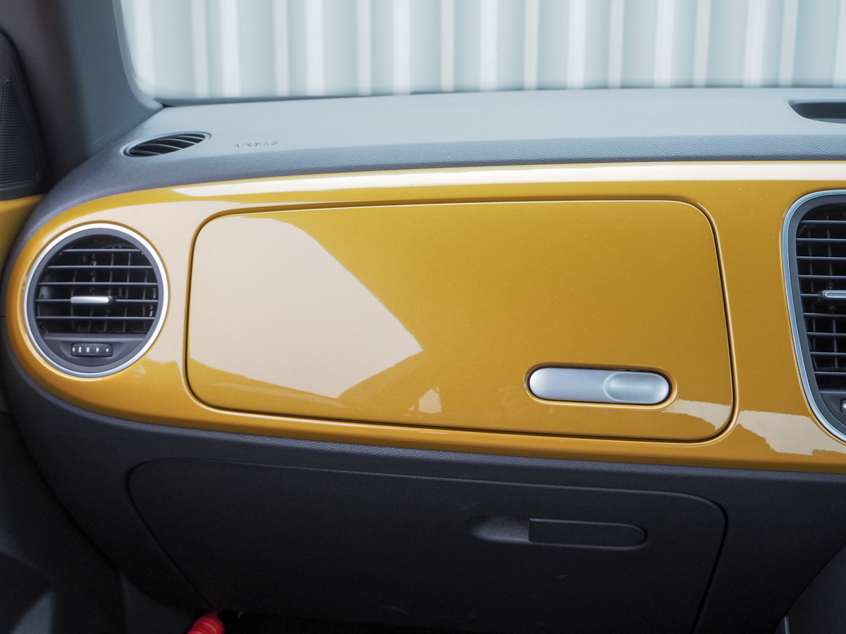 ドアを開けると、インテリアも明るいですね。インパネにボディ同色のパネルが貼られるのは、ベースモデルである「ザ・ビートル」と同じですが、限定色であるサンドストームメタリックがグッド! いやぁ、イエロー系の内装、見たことあります?