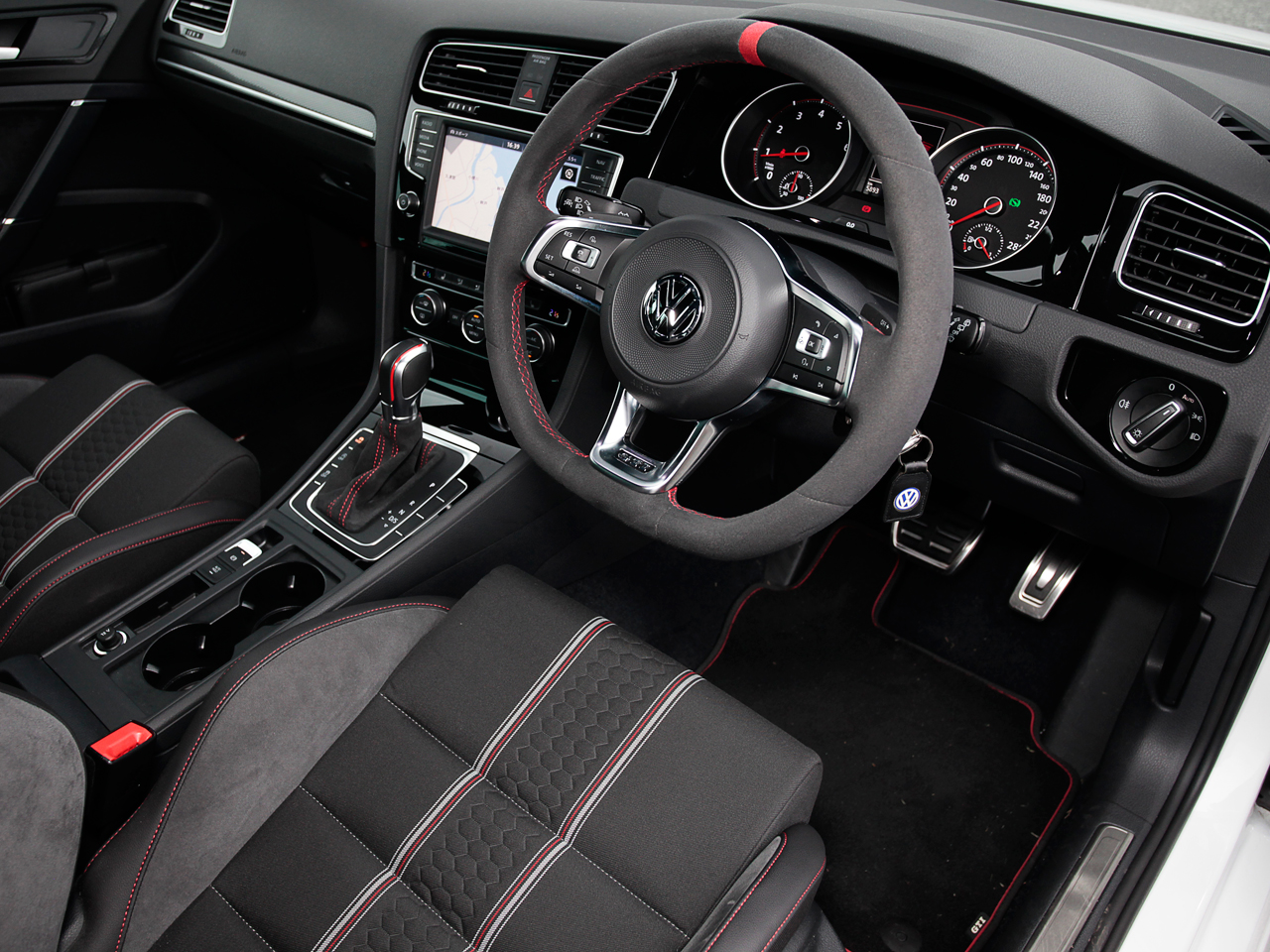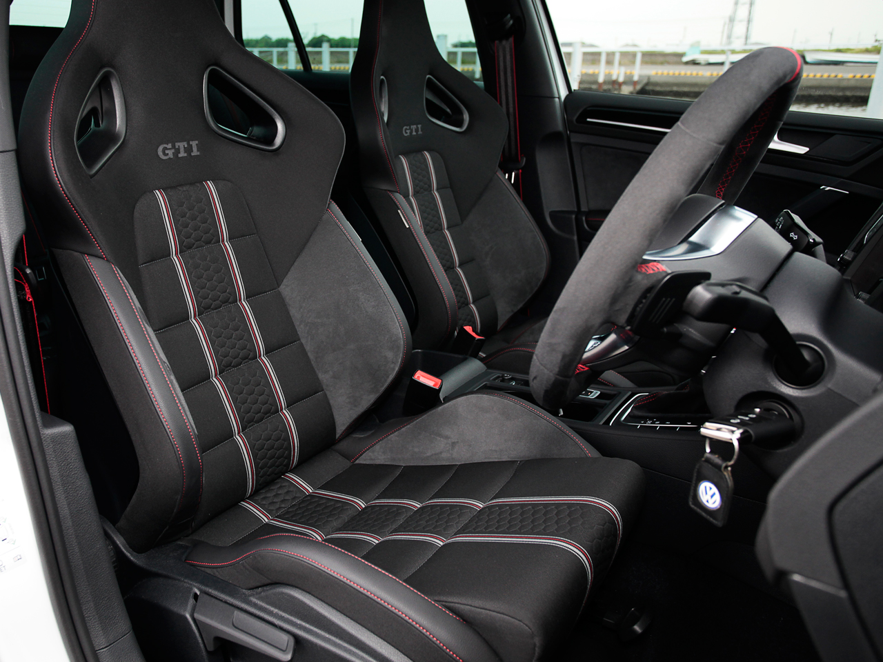 ただ者ならぬ外観のスペシャルGTIですが、ドアを開けるとさらに「オッ!」と思います。レーシーなレカロ製バケットシートがドライバーを待ち構えていて、人工スエードのアルカンターラが巻かれたステアリングホイールは、頂点部分に赤いマークが施されます。これを見たら、ニュルブルクリンクの北コースで、FF量販車として最速タイムをたたき出した「ゴルフ GTI クラブスポーツS」に想いを馳せずにはいられません!