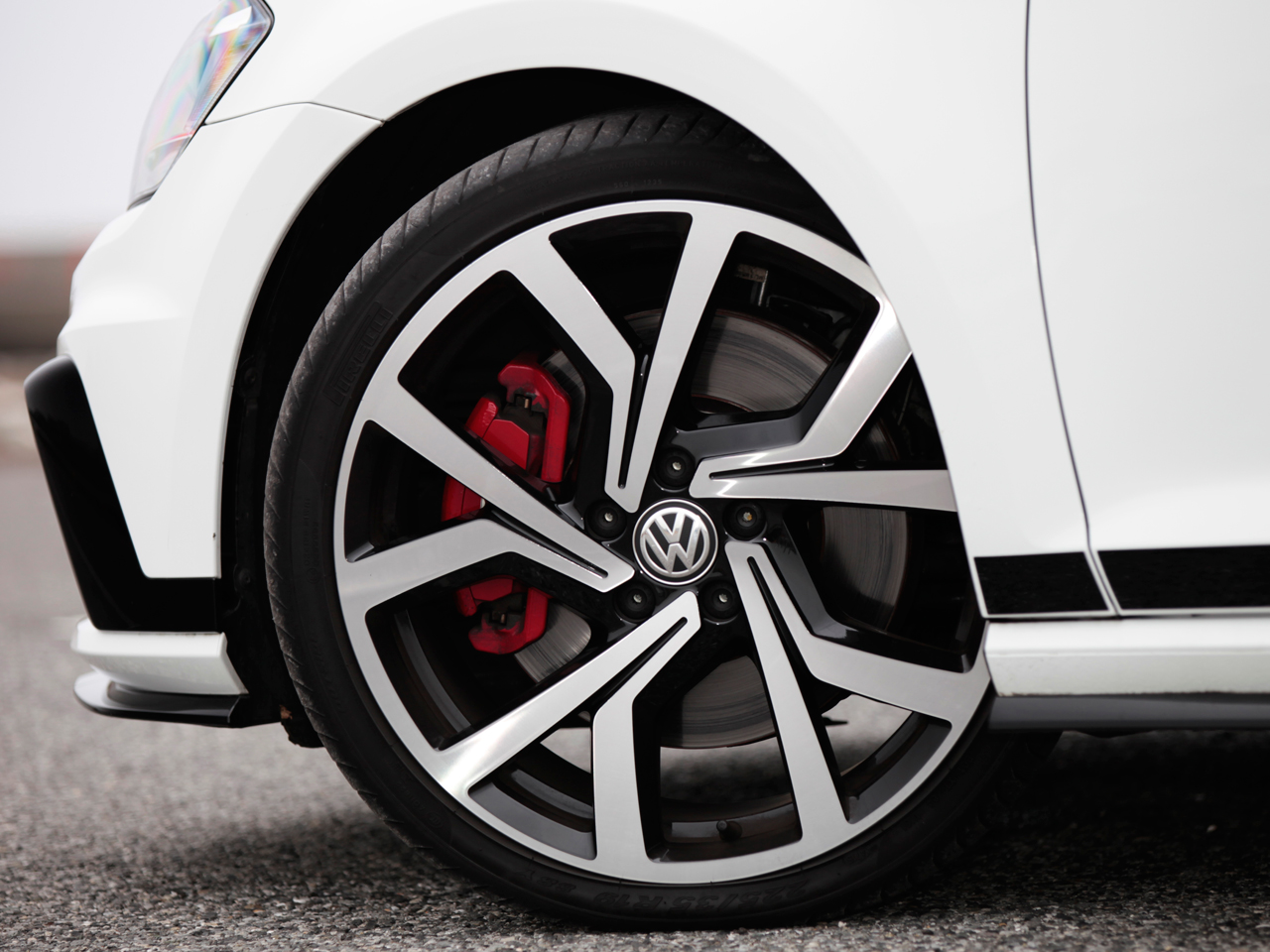 まず、一見して“シャコタン”です。サスペンションそのものがローダウンされている上、ホイールがノーマルのGTIより1インチアップの18インチとなっているので、タイヤとホイールハウスのすき間が狭い。スポーツモデル好きなら、そこを見ただけで「ニヤリ」とすることでしょう。専用ホイールには、225/35の薄いスポーツタイヤ、ピレリ「P-ZERO」が巻かれます。