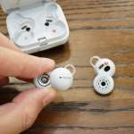 まず「LinkBuds」は外見から特殊で、本来耳穴を塞ぐ箇所がリング状になっていて、リング部分が音を鳴らしつつ、真ん中からスルーで周囲の音が入ってきます。SONYロゴ入りの本体(?)部が横に付いている構造も特殊ですが、耳への収まりは人間工学的に正しくできていてフィットしやすい。