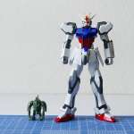 同梱されるENTRY GRADE 1/144 ストライクガンダムを一緒に並べてみると、こんな感じ。1/144と約1/1500の差は歴然です。劇中ではストライクガンダムの全高が約17.72mなので、モビルゾノのほうがちょっと大きいんですけどね。