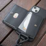 「ショルダーストラップ付MagSafe対応iPhoneケース」のセットは、スマホケース(左)とストラップ付ウォレット(右)がそれぞれ独立して使えるうえ、マグネット仕様なので瞬時に着脱可能!