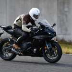 そして、コーナーリングではスリムな車体が倒し込みやすく、それでいてバンク中の安定感も高いので、「次の周回ではもうちょっとがんばってみようかな」とチャレンジをしたくなります。特にフロント周りの安心感がすばらしく、コントロール性の高いブレーキでフロントフォークを縮ませつつ、荷重をかけたままコーナーに入って行くような走り方を気兼ねなく試せました。