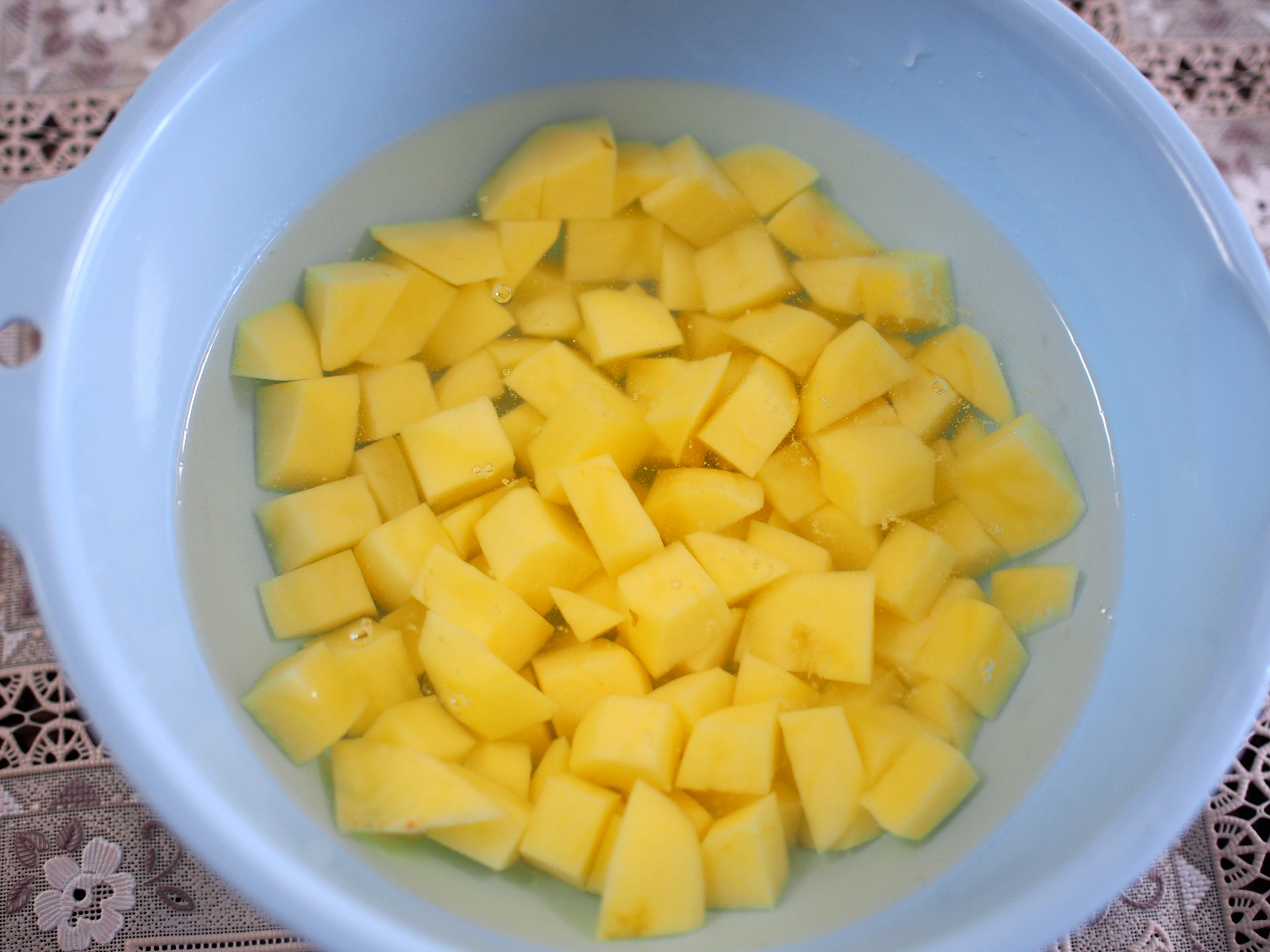 まずは、じゃがいもの皮をむいて1cm角に切りましょう。1cmよりも大きくなるのはなるべく避けたいところ。皮をむくのが面倒なら、そのまま切って”皮付きポテト”にするのもアリです。切ったじゃがいもは水にさらしてアクを抜きます。