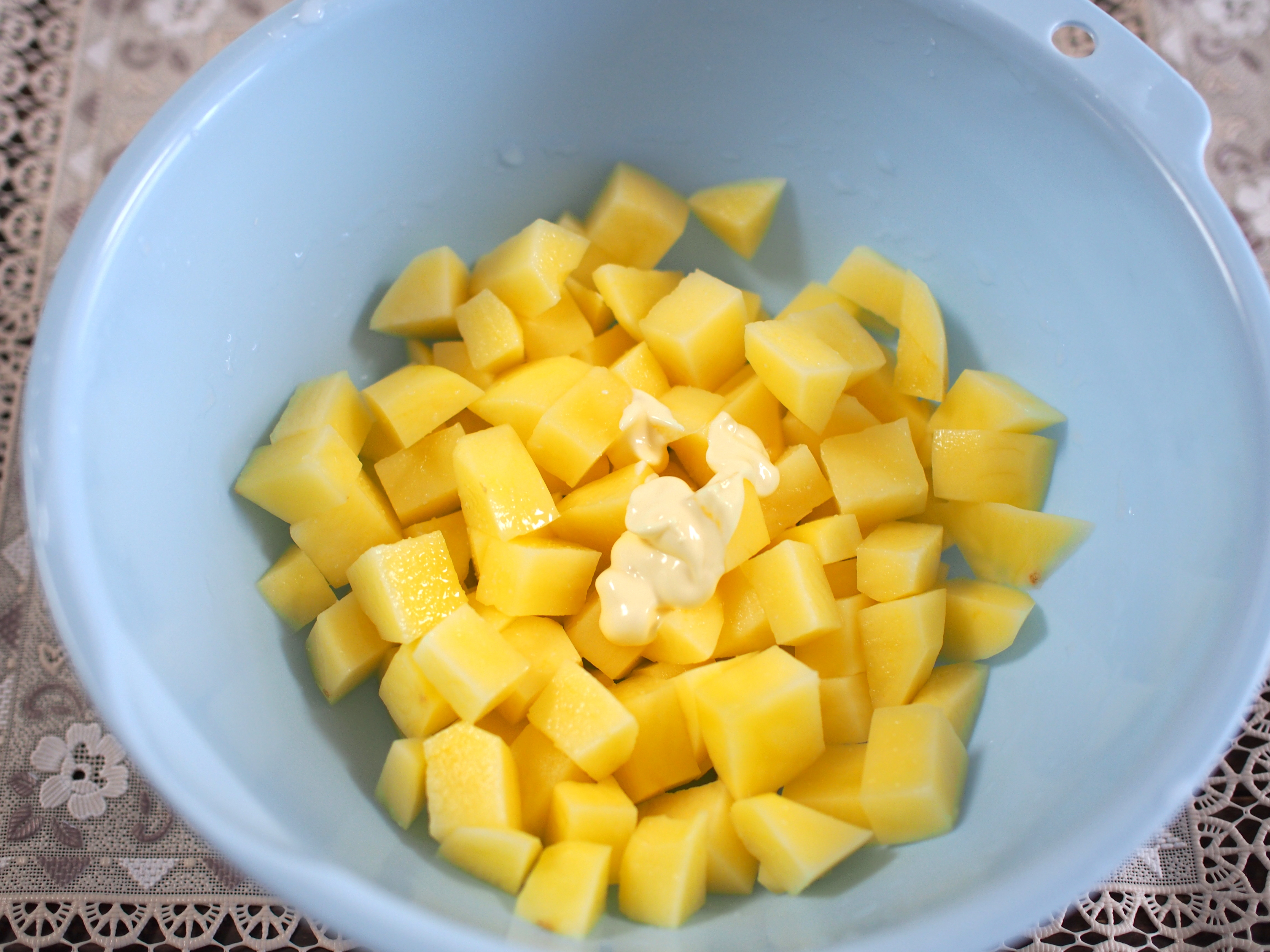 水気を切ったら、小さじ1杯のマヨネーズと適量の塩をふりかけてよく混ぜます。