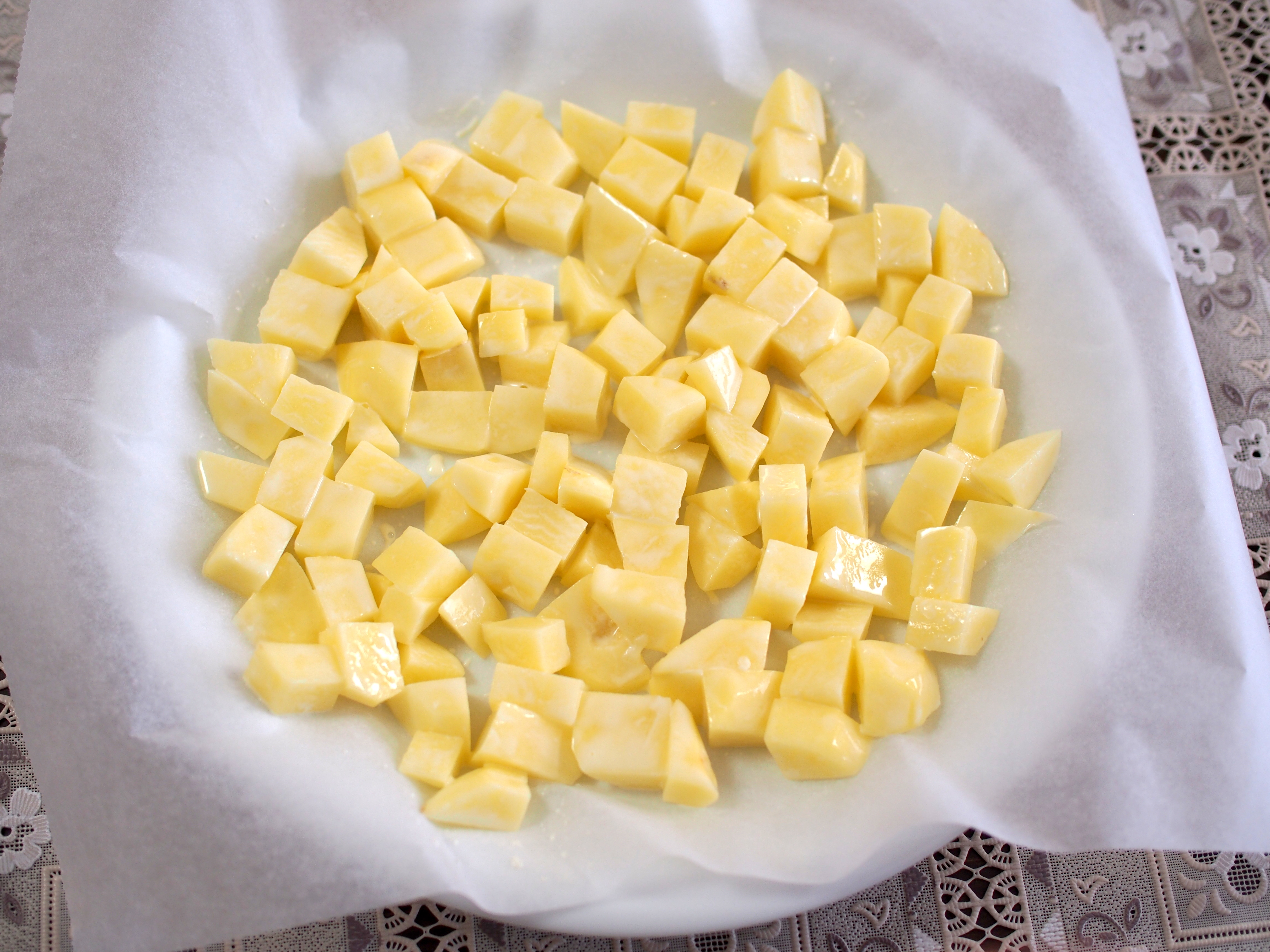 続いて耐熱皿やクッキングシートの上にじゃがいもを広げます。