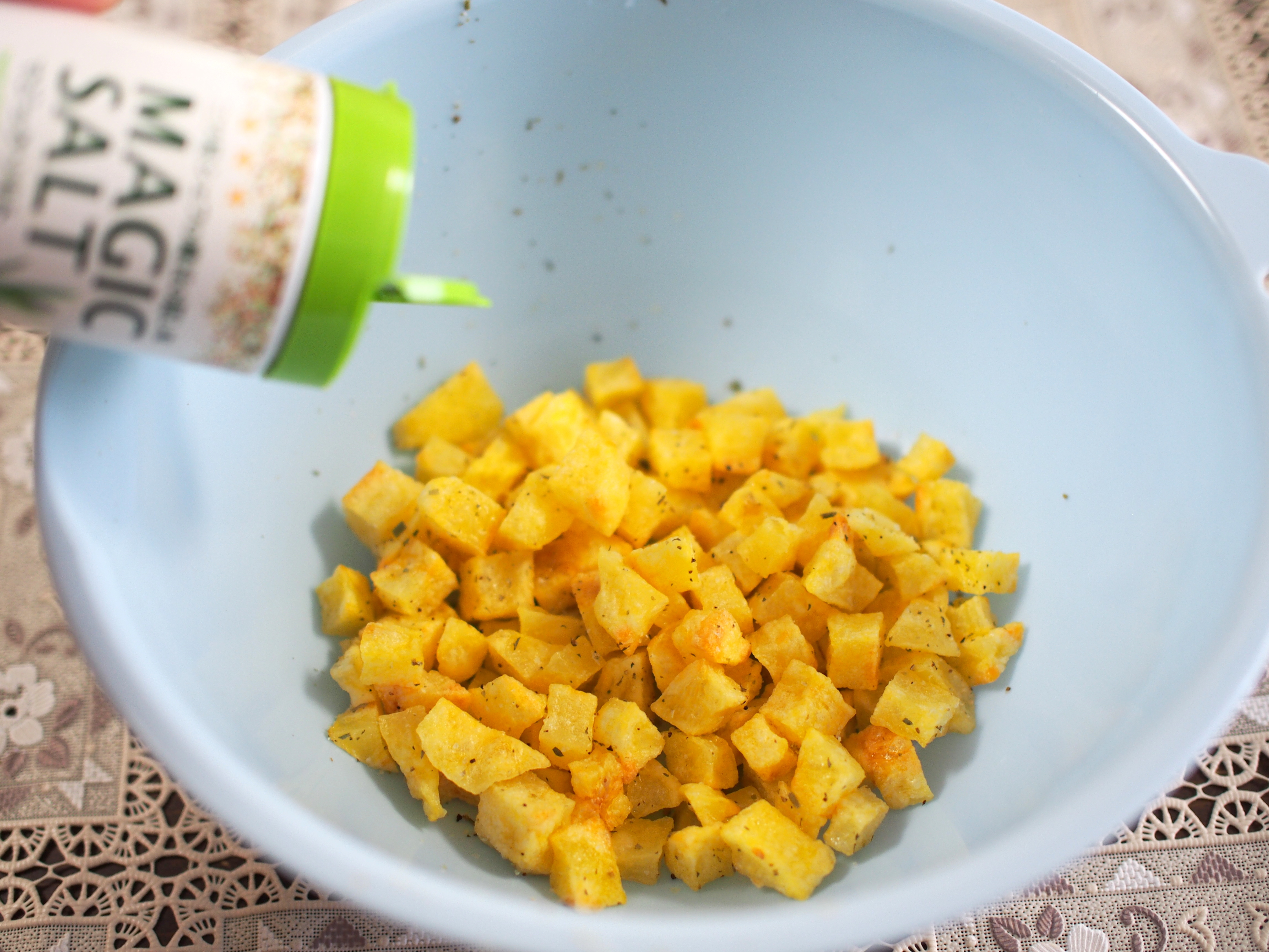 加熱が完了したら、温かいうちに塩やお好みのスパイスをかけましょう。今回はちょっとおしゃれに、ハーブと塩がミックスされている「マジックソルト」をかけてみました。