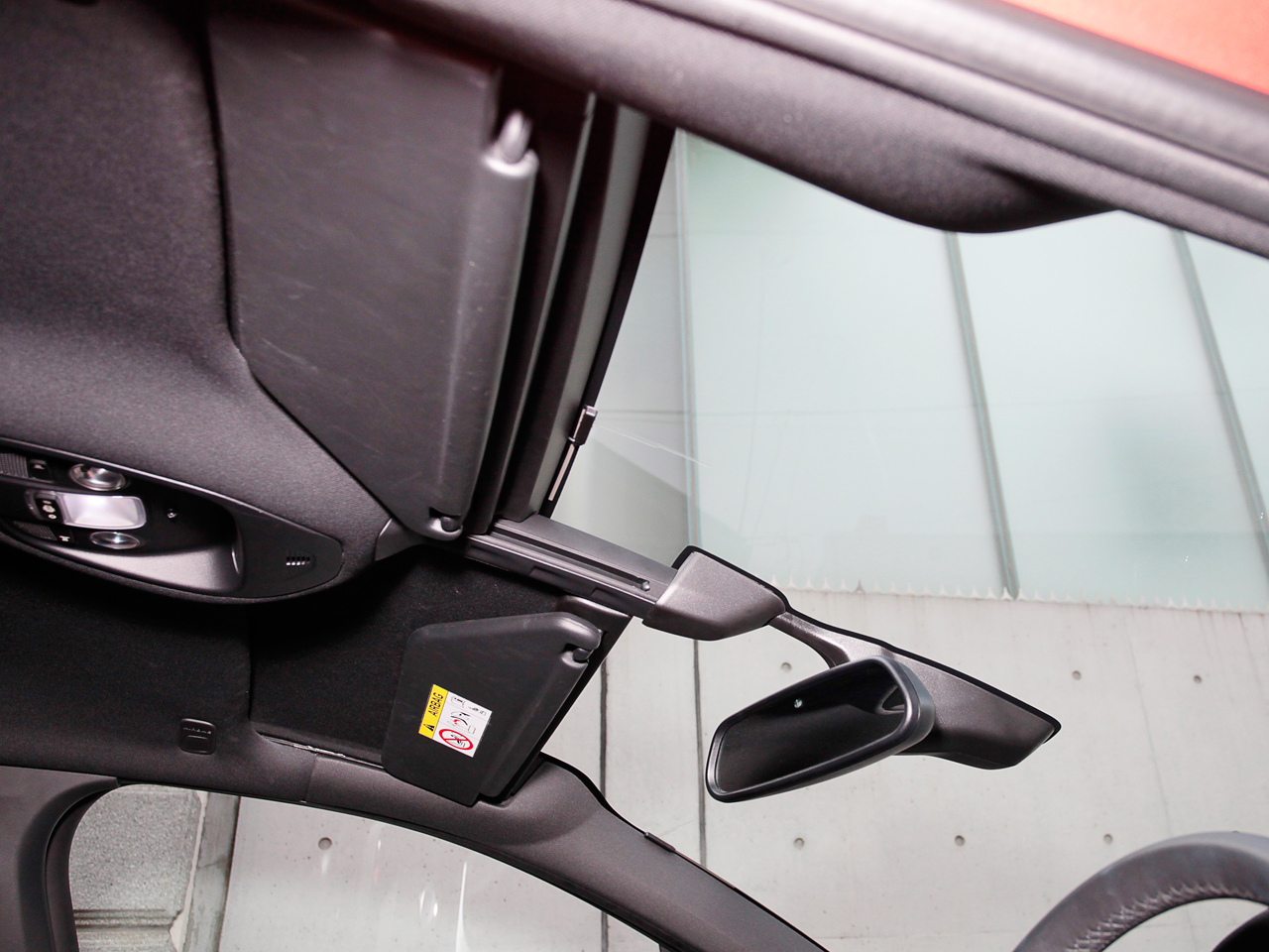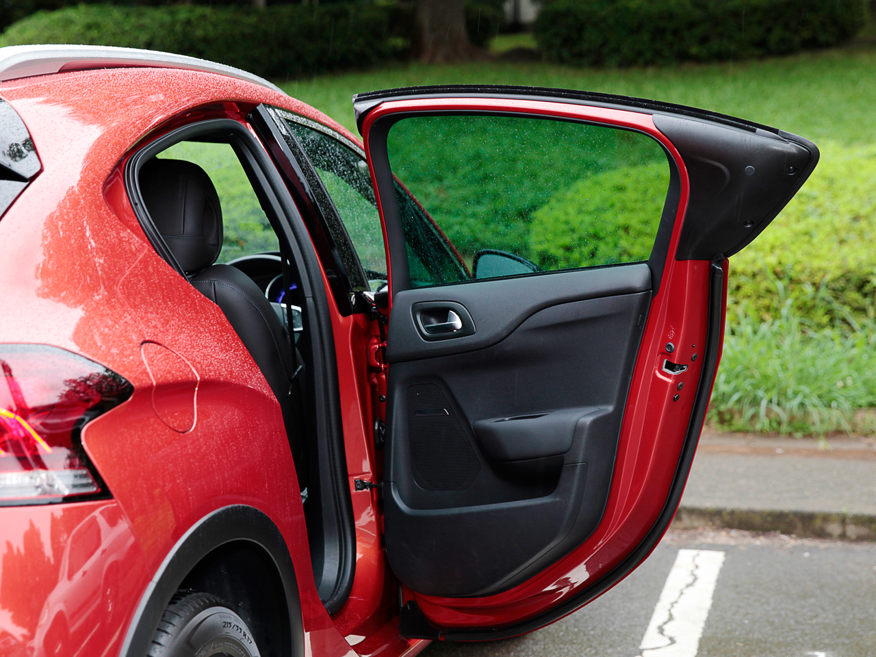 後ろ下がりの流麗なルーフラインに、Bピラーをブラックアウトしてサイドウインドウと一体化したウインドウグラフィック、さらに、後方へ延ばしたリアサイドガラスの後端にドアオープナーを埋め込んだデザインは、クーペルックのDS4ゆずり。同様に、リアのドアを開けると、後方へ鋭角なサイドウインドウ後端部が飛び出して乗り降りする人を脅かす(!?)弊害も、DS4から引き継がれました。コレ、日本のメーカーだったら、決して「Go!」が出ないデザインでしょう。しかも、リアのサイドウインドウは“はめ殺し”で開きません! デザインコンシャスを掲げるDSの、面目躍如といったところです。
