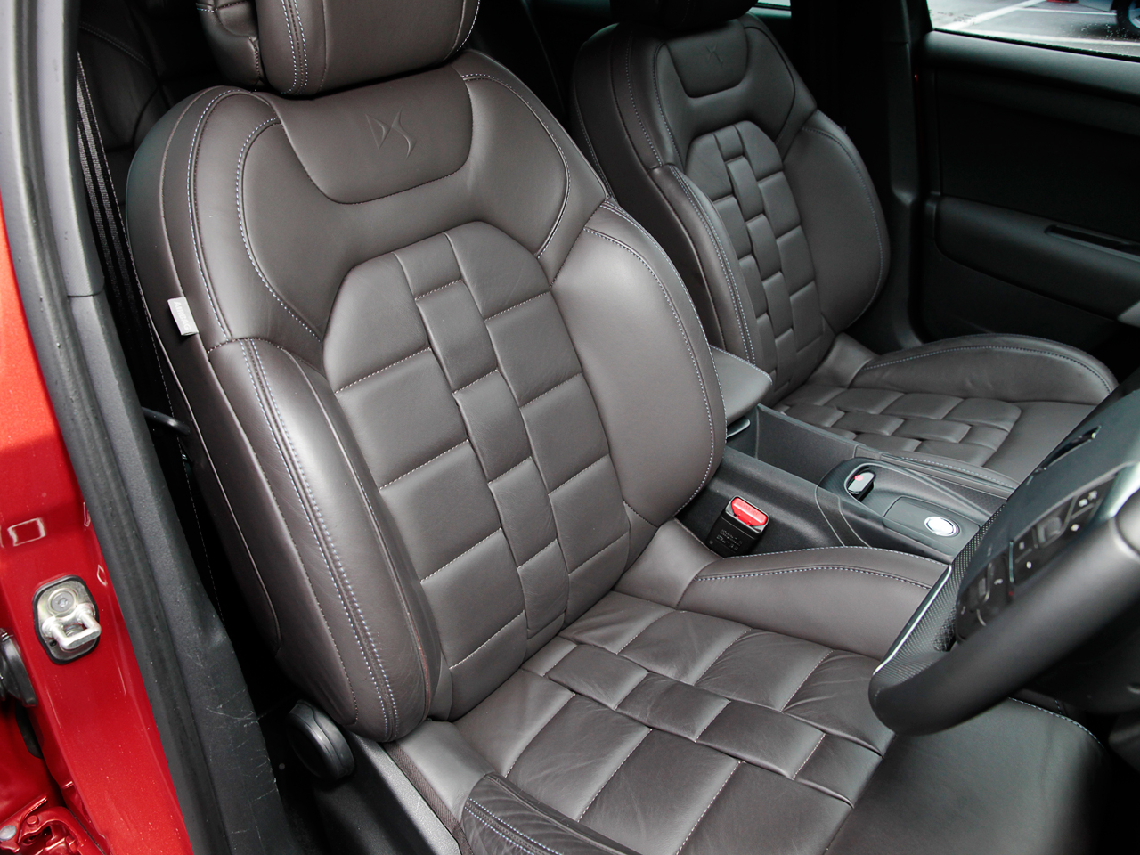 一方、フロントのドアを開けると、オプションの“クラブレザーシート”(38万円)が迎えてくれました。体が当たる部分を3列の細かいブロックに分け、立体的に裁断した贅沢なシートです。車内でおせんべいなんて食べようものなら、ブロックの間に食べかすが挟み込まれて大変なことになりそうですが、いい大人はDS4 クロスバックの中でおせんべいを食べるなんてことはしません(ぬれせんべいにしときましょう)。