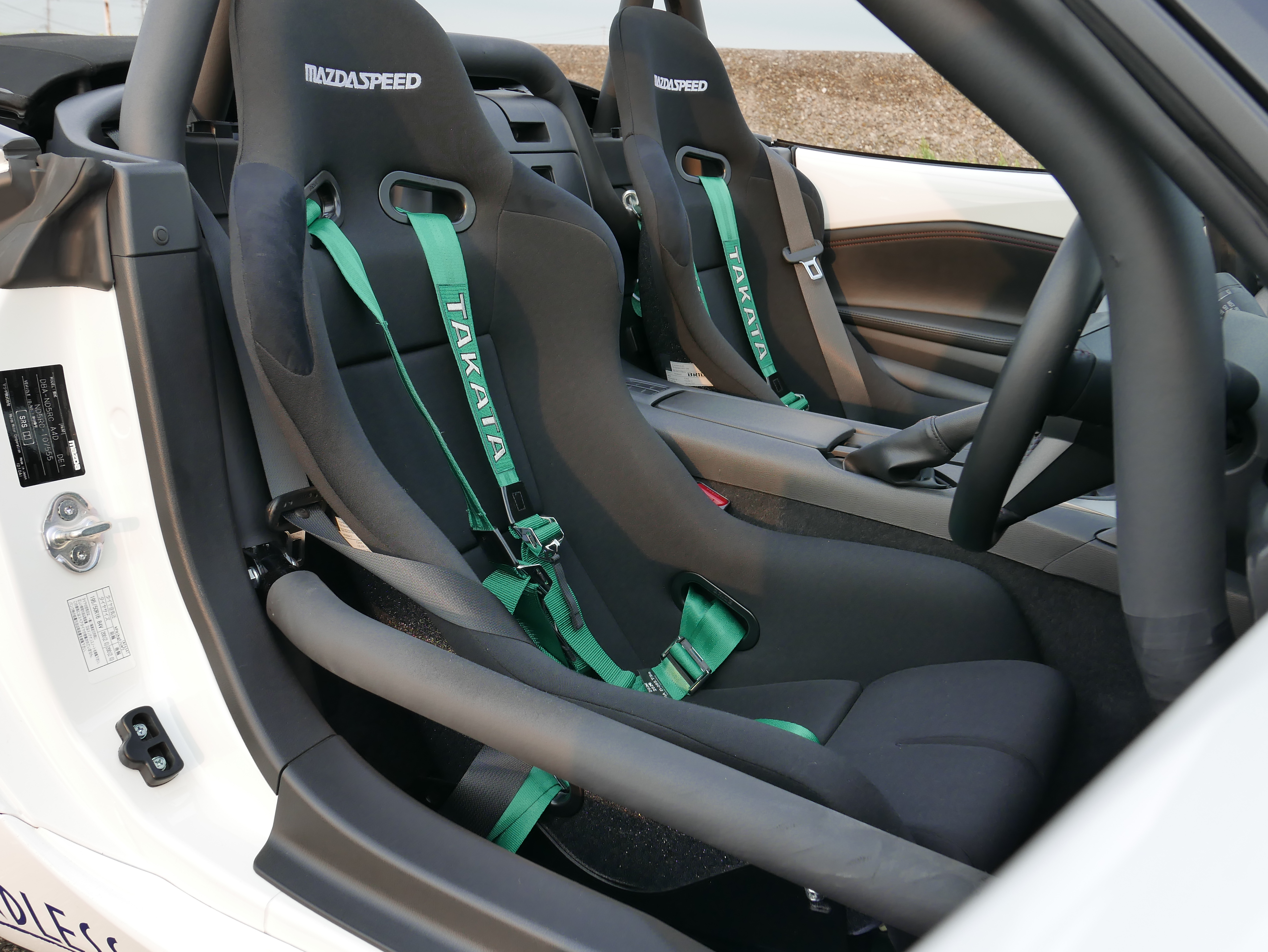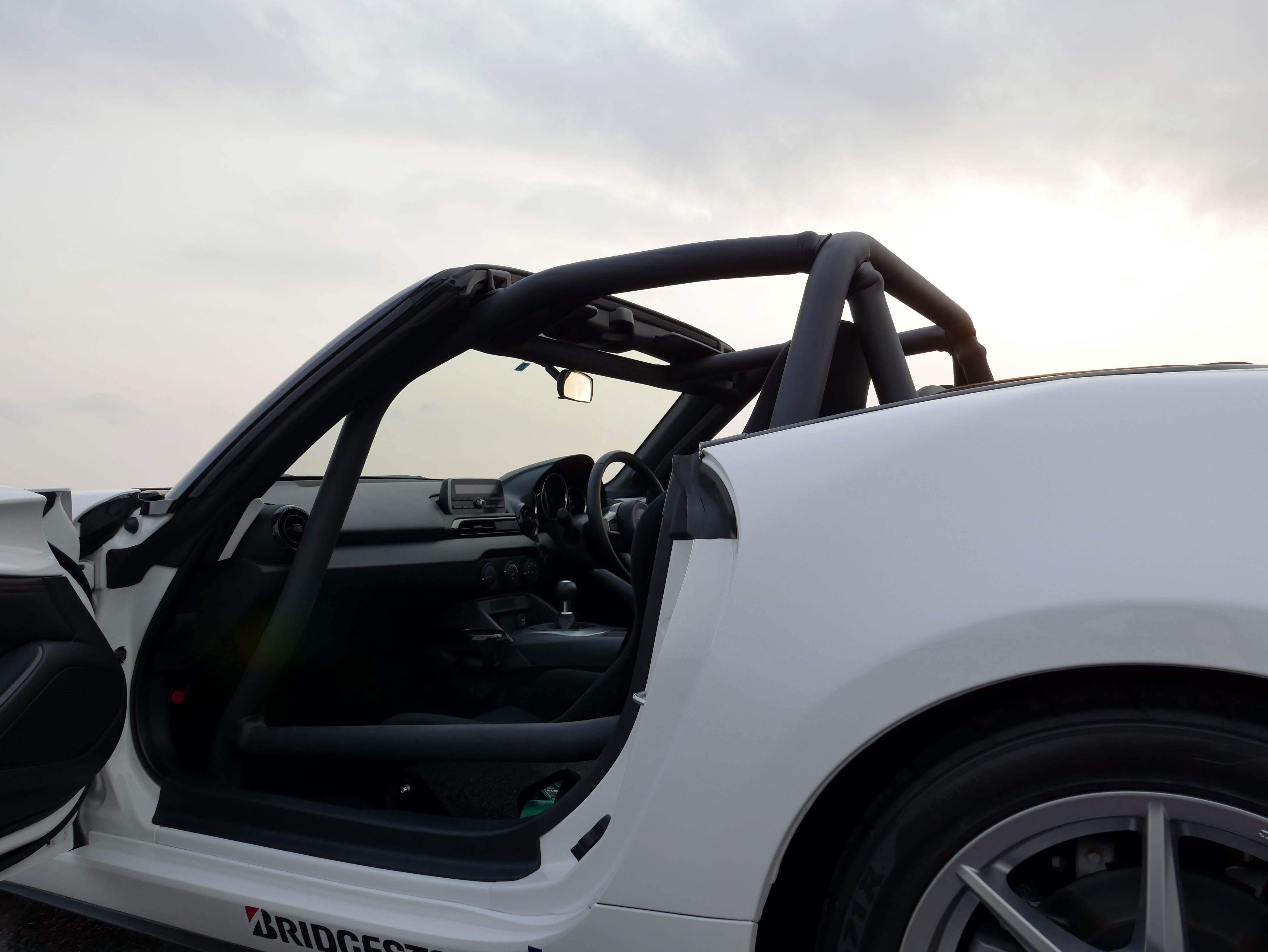 試乗車にはガッツリとロールバーが付いていましたが、これはオプション。サーキット走行や競技へ参加する場合、ロールケージの装着が定められていることは珍しくありませんので、その気になったら必要な装備です。基本、転倒した時にドライバーを守る安全装備ですが、ボディ剛性アップにも寄与します。