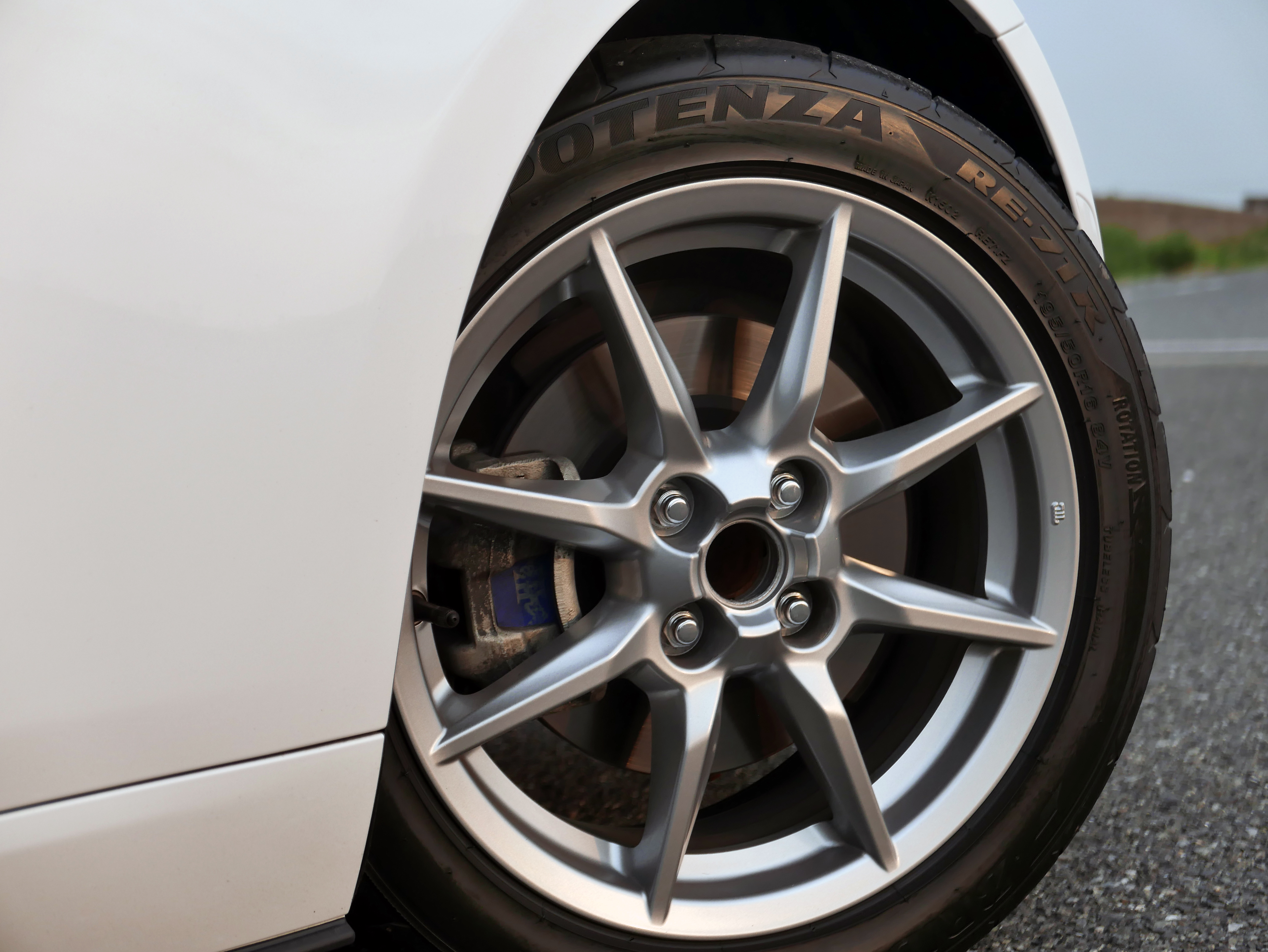 まずはサスペンション。ショックアブソーバーはビルシュタイン社製の車高調整機能付きスポーツタイプを標準装着。約30mmの車高調整幅があり、試乗車は調整範囲の中で最も車高が下がった状態でした。そしてタイヤは、オプションとして設定されているブリヂストンの「ポテンザ RE-11A」。