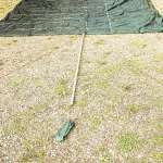 ポールとタープを配置したあと、ここが最も重要な部分なのですが、ポールを立てるためのロープを、あらかじめきれいな二等辺三角形となるように配置してください。