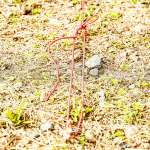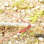 先ほどポールの先端はもやい結びをしたロープの端(地面側)はポールを寝かした状態でいいので仮でペグダウンしておきます。トラッカーズ・ヒッチで固定してますが、後で調整する部分が大きいので、これも仮留めにしています。