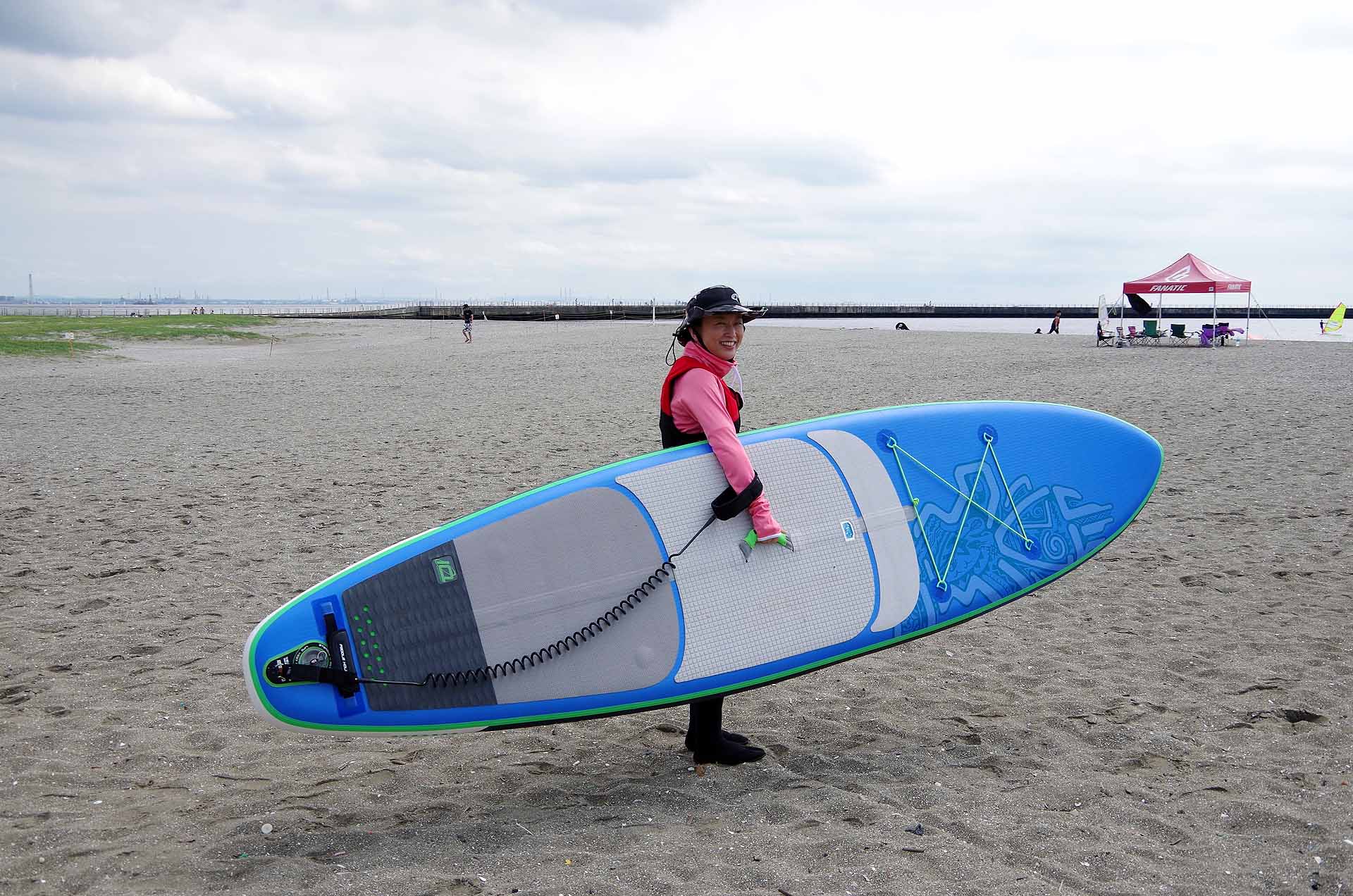 追い風に乗って漕いでいるので、海に出て5分も経っていないのに結構な距離を進んでいる様子。このあたり、完全に背の立たない深さですよね……。そこで鈴木さんの「もう大丈夫そうなので、立ってみましょうか」の声が! え、もう? SUPでもサーフィンでも立つまでが大変だって言うじゃないですか。無理だろうと思いつつ、勢いでやってみたところ…….