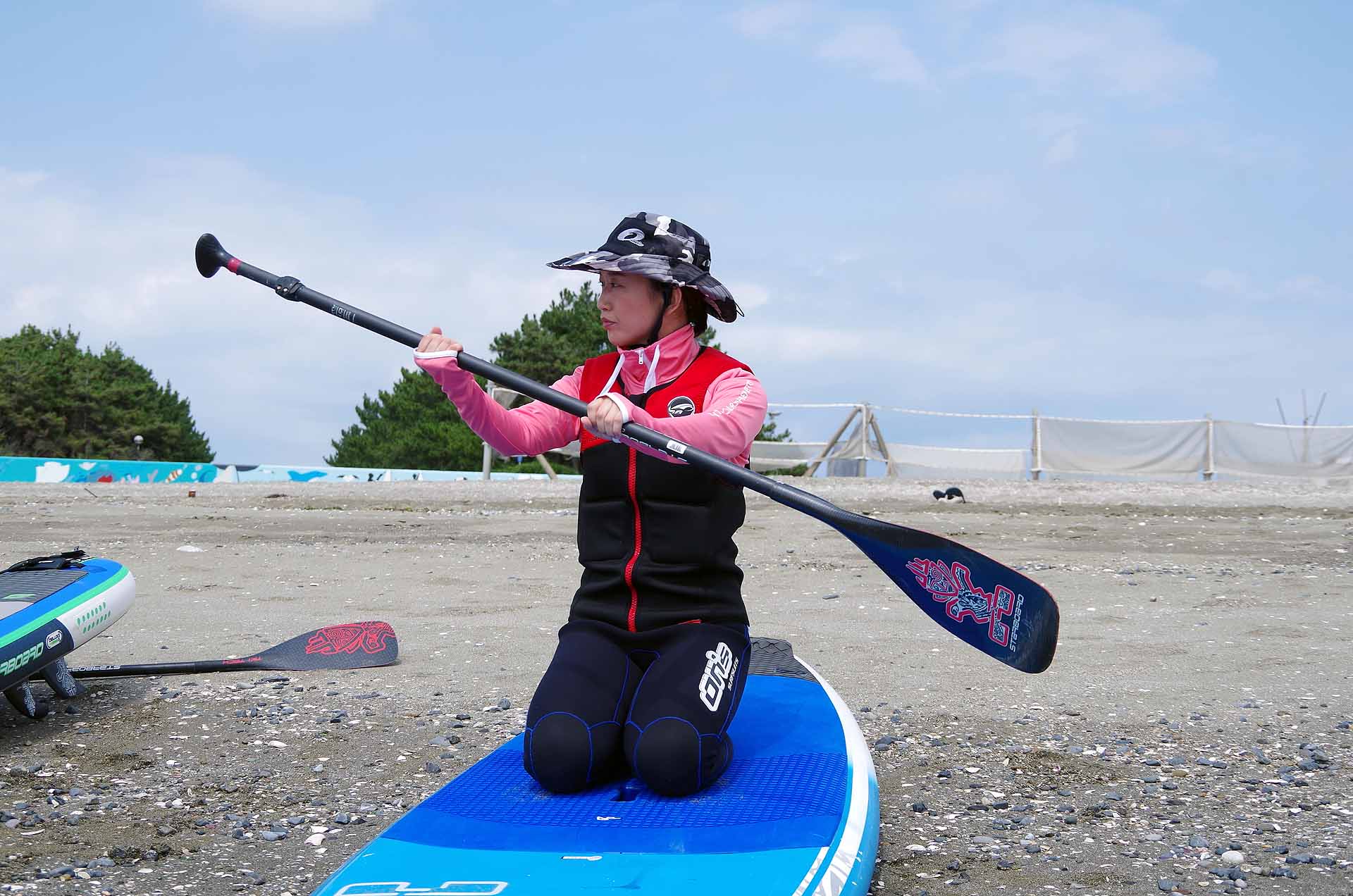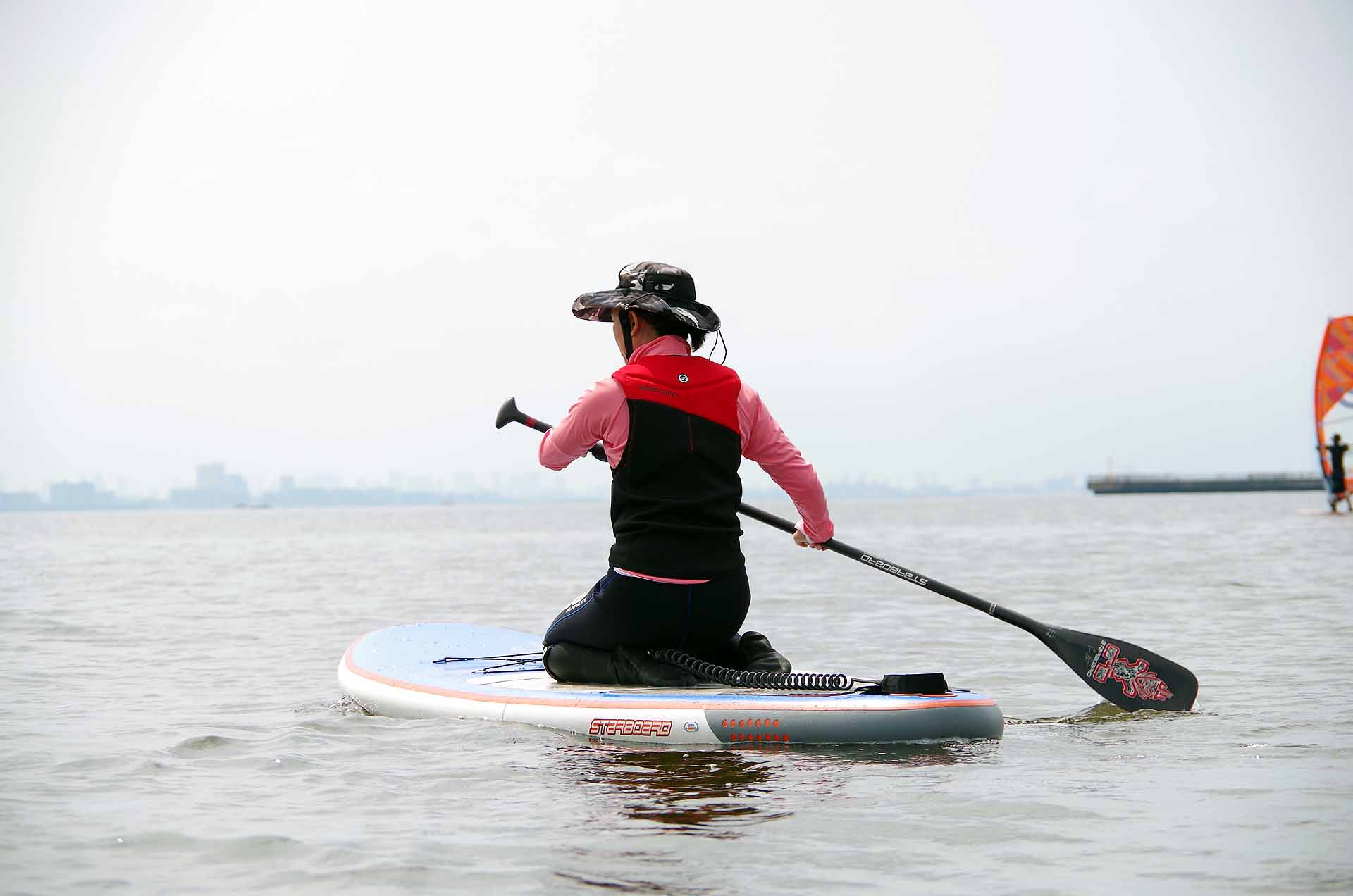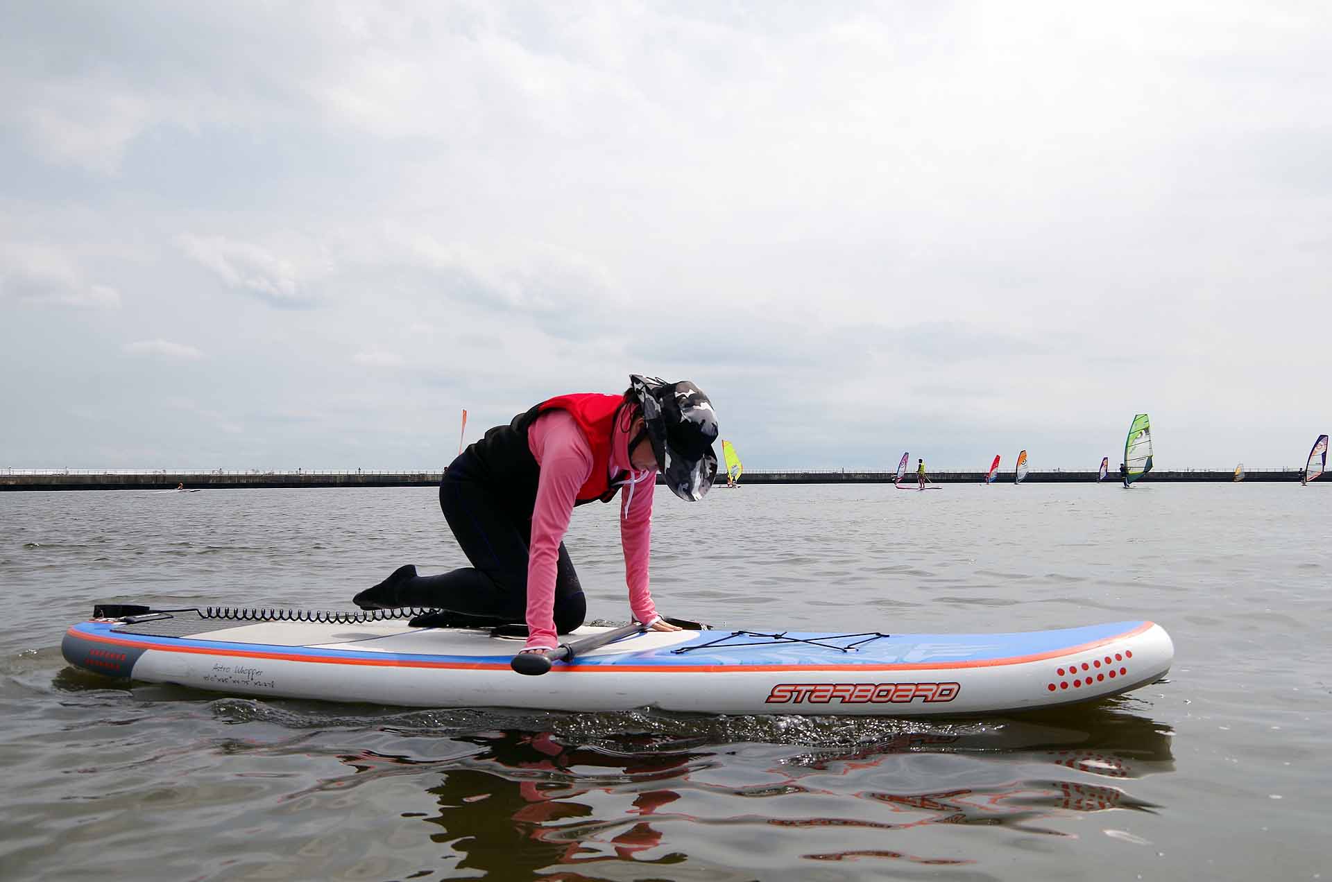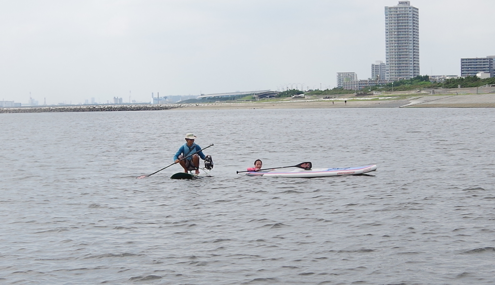 正座したまま風下に向かってパドルを漕ぎ進みます。それほど風は強くありませんが、最初はなかなか思う方向に進んでくれません。パドルの使い方にコツがあるようで、片側だけ一生懸命漕いでも上手く進まない。右側を2、3回掻いて今度は左側を2、3回、これを小刻みに繰り返すとイイ感じに進むようになりました。ちなみに、SUPのパドルはこうして左右頻繁に持ち替えるので、動きの妨げになりそうなリーシュを付けないのだそうです。うっかり落として流されないように気をつけないと!
