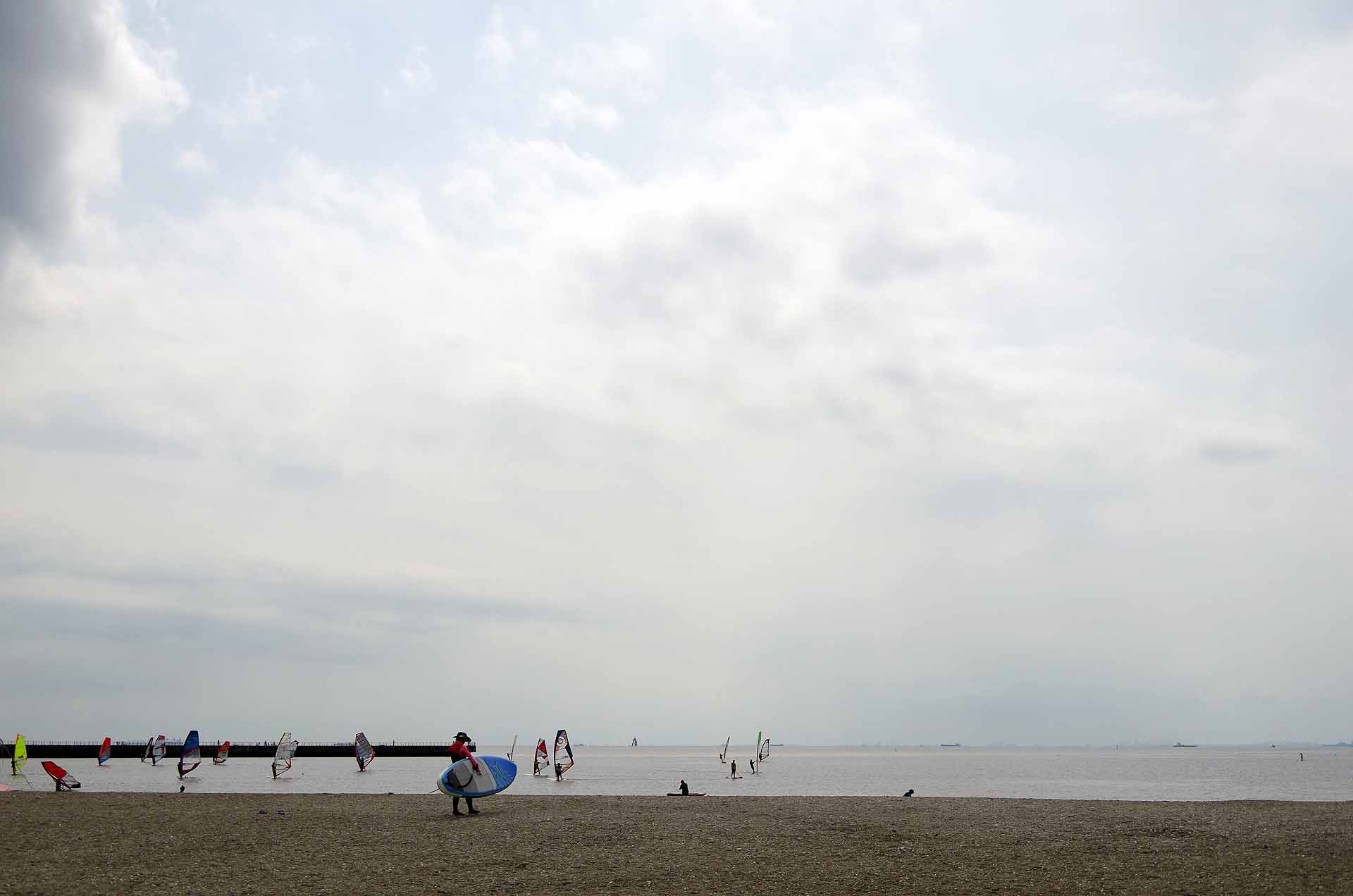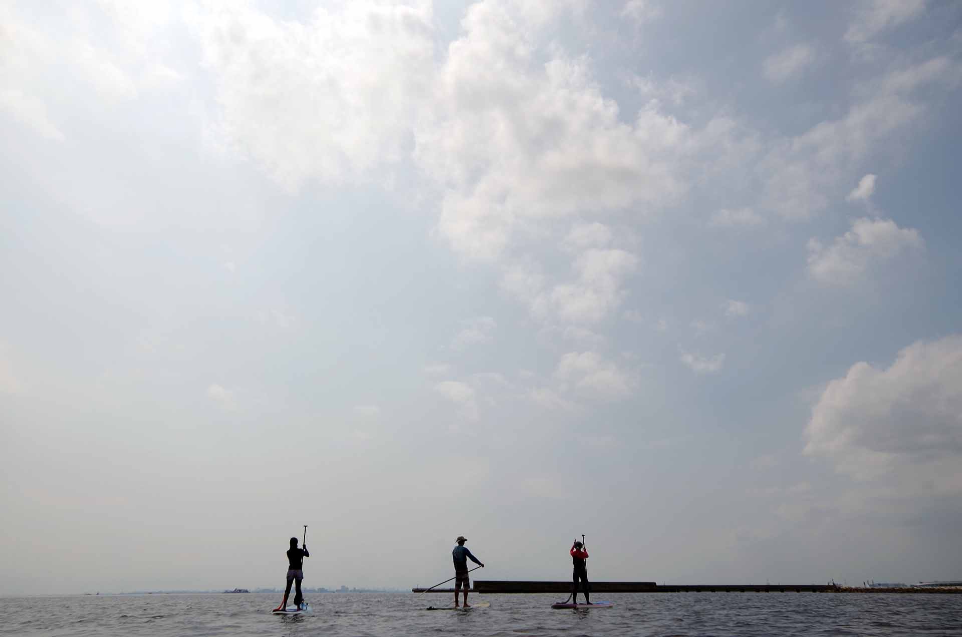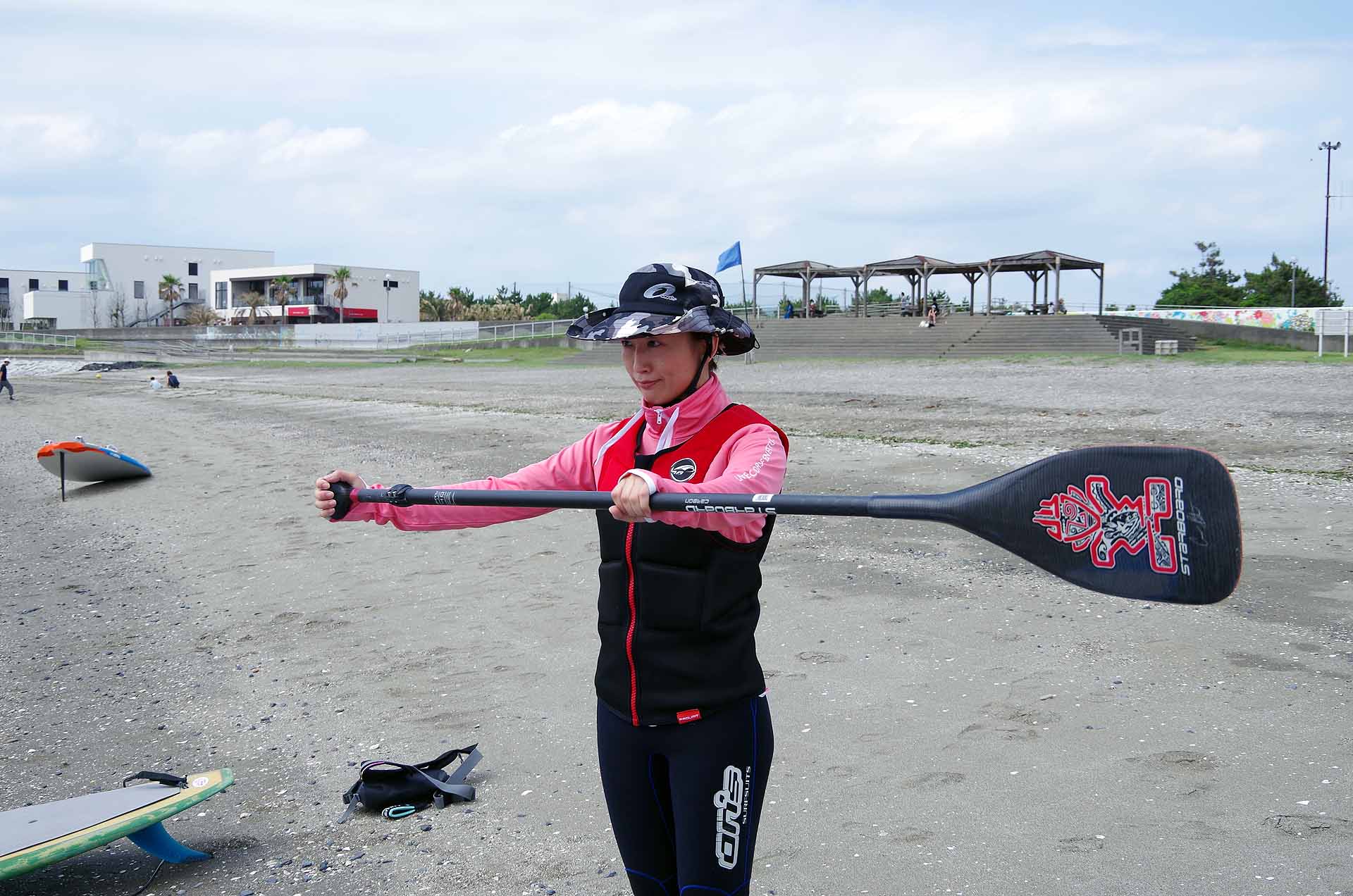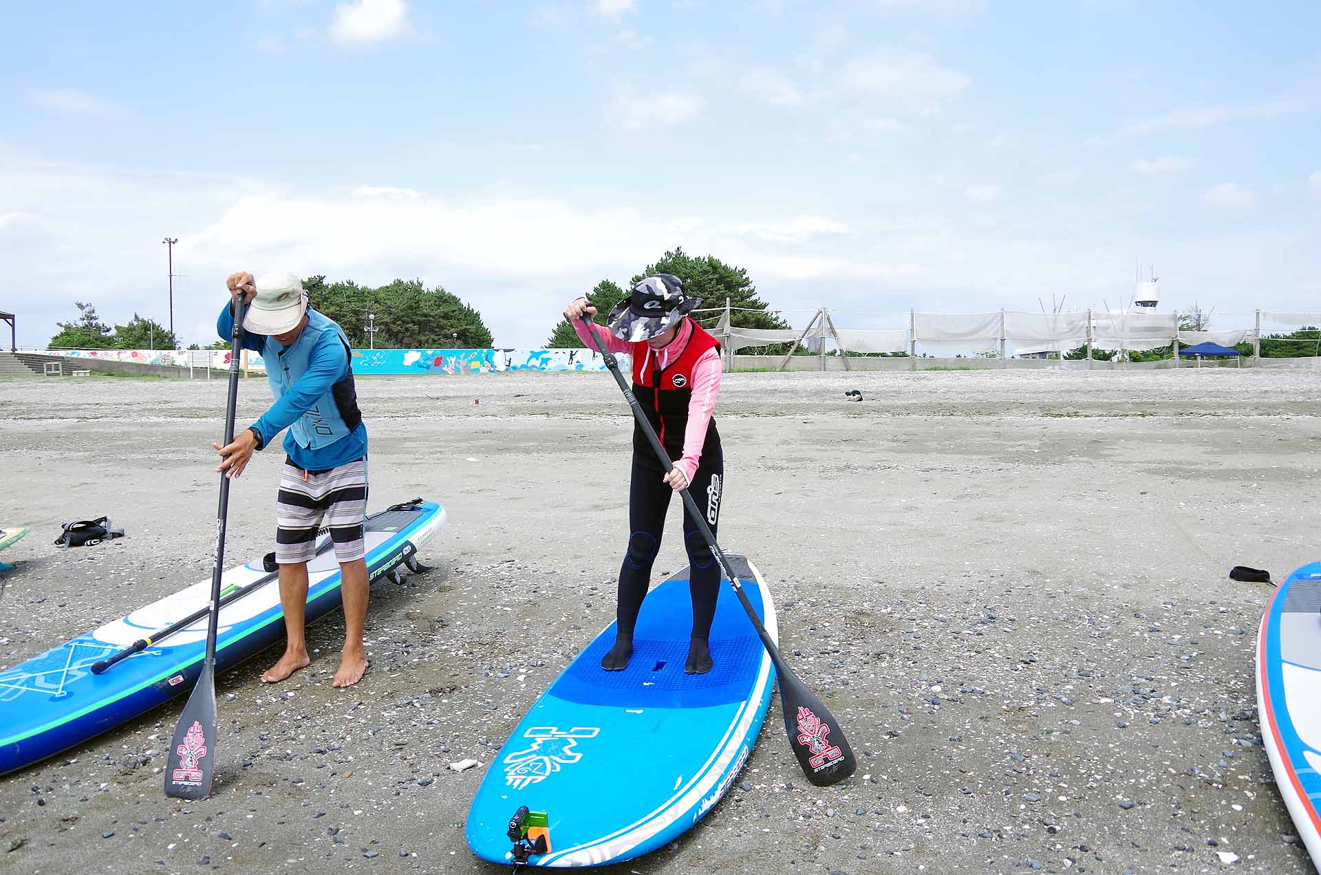 正座したまま風下に向かってパドルを漕ぎ進みます。それほど風は強くありませんが、最初はなかなか思う方向に進んでくれません。パドルの使い方にコツがあるようで、片側だけ一生懸命漕いでも上手く進まない。右側を2、3回掻いて今度は左側を2、3回、これを小刻みに繰り返すとイイ感じに進むようになりました。ちなみに、SUPのパドルはこうして左右頻繁に持ち替えるので、動きの妨げになりそうなリーシュを付けないのだそうです。うっかり落として流されないように気をつけないと!