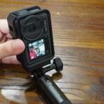 使い始めて便利だと気づいたのが「DJI Osmo Action 3」のアドベンチャーコンボに含まれる延長ロッド(いわゆる自撮り棒)。24cm~152cmまで伸縮可能で、カメラ取り付け部はマグネット+ツメで固定。保護フレームを付けることで縦向き固定もできます。カメラ本体と延長ロッド、この取り回しの良さが実に優秀。ちなみに、このロッド、底に三脚穴もあります。