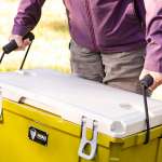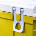 大型のハードクーラーはひとりで持ち運びにくいのが難点ですが、「HYAD クーラーボックス 47R」には長めのナイロン製ロープとEVA素材の持ち手が付いていて、ひとりで持って歩けます。特に不安定な雪の上では、持ち運びやすさがうれしいんです。