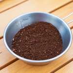 ミルで中挽き。シェラカップの100mlの線のあたりになりました。もし、軽量スプーンを忘れたらこれを目安にするといいかも。