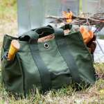 「焚き火バッグ」があれば、焚き火まわりの道具といっしょに残った薪を持ち帰れるし、グロメットに紐を通して縛っておけばバケツと違って不意に蹴り倒しても薪と木くずをばらまく心配なし。車内や倉庫での保管も安心です!