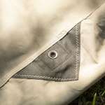 「タープ1TC」のグロメットは四隅だけでなく8か所。ポールを差して突き上げる、張り綱を通して雨水の通り道にするといったアレンジにも対応しています。