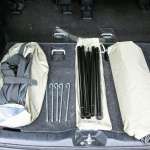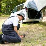 幕には張り綱が取り付けられています。クルマの後部にタープをかけてウェビングで固定したら、張り綱を地面に打ち込んでポールを差し込めば完成です。