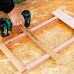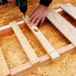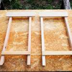 次に幅が狭い方のフレームの上端から150mmのところに10×90×400の板を、370mmに15×40×400の材を、こちらもビス留めします。
