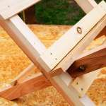 梯子型のフレームが2個になりました。途中に入る材の長さや位置が微妙で難しそうですが、ここが重要になります。2つのフレームをX型に交差させるように組み立てると、ちょうどクロスする場所で材木同士がぶつかり合って組み合わさるのです。