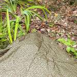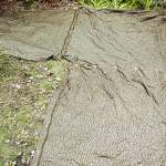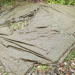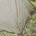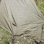 東ドイツの軍幕は各辺の真ん中あたりにループがあります。他の軍の正方形幕の場合は真ん中か、または真ん中より角(この場合は右上の角)に少し近い方のボタンホールを使ってペグダウンすると良いと思います。この部分はしっかりとペグダウンしてください。