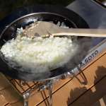 グレイビー作りはまず、ニンニク、ショウガを炒める…のですが、玉ねぎのみじん切りに気が向いていて、忘れてしまいました。なので気を取り直して、フライパンに油をしいて先ほどみじん切りにした玉ねぎを入れ、炒めます。