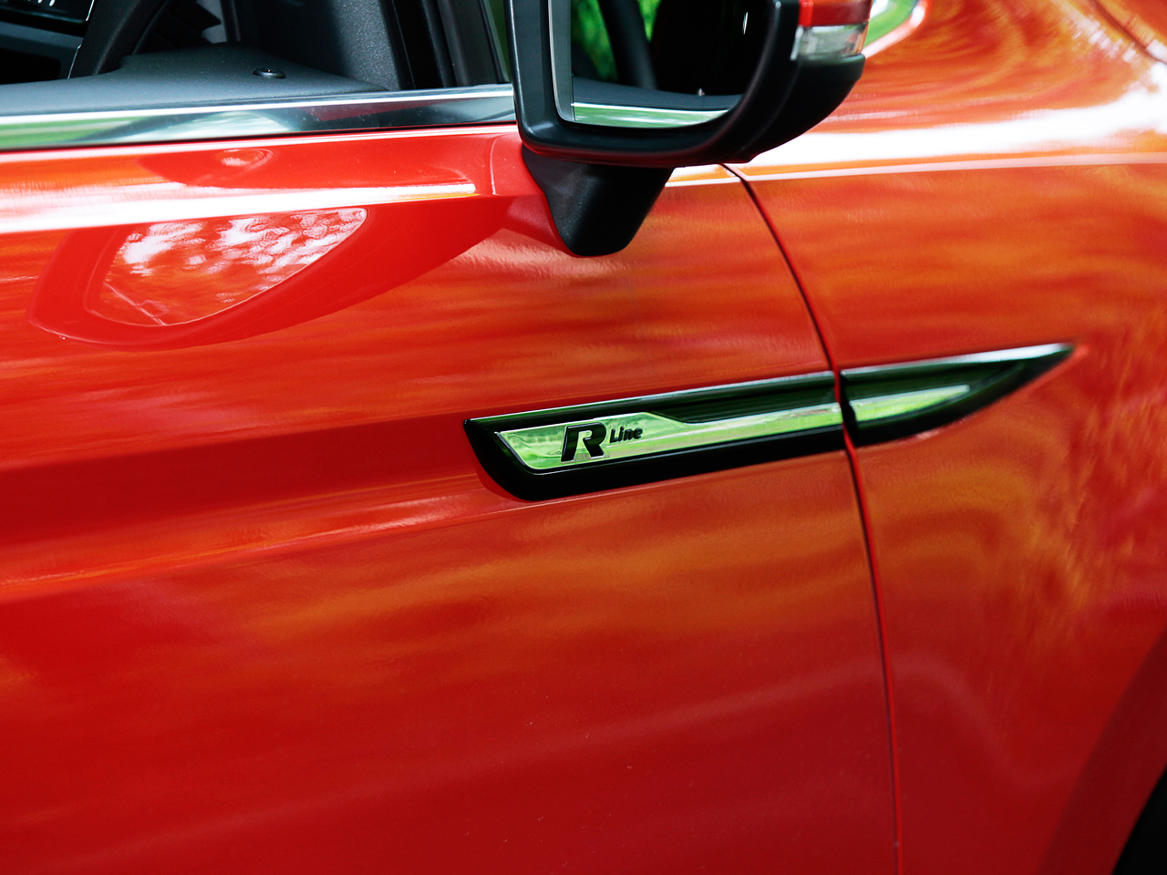 まず、フロントとリアバンパーがRライン専用デザインとなり、ブラックアウトされたサイドスカートが付きます。フロントバンパー下部やサイドのエアインテークにはクロームのバーが付加され、ググッと華やかな印象に。グリルと左右のフロントドアには、Rラインのエンブレムが輝きます。ドアを開ければ、サイドシルにRライン専用ドアシルプレートが貼られるので、乗り込むたびに、ムフフ…とうれしく感じるわけです。