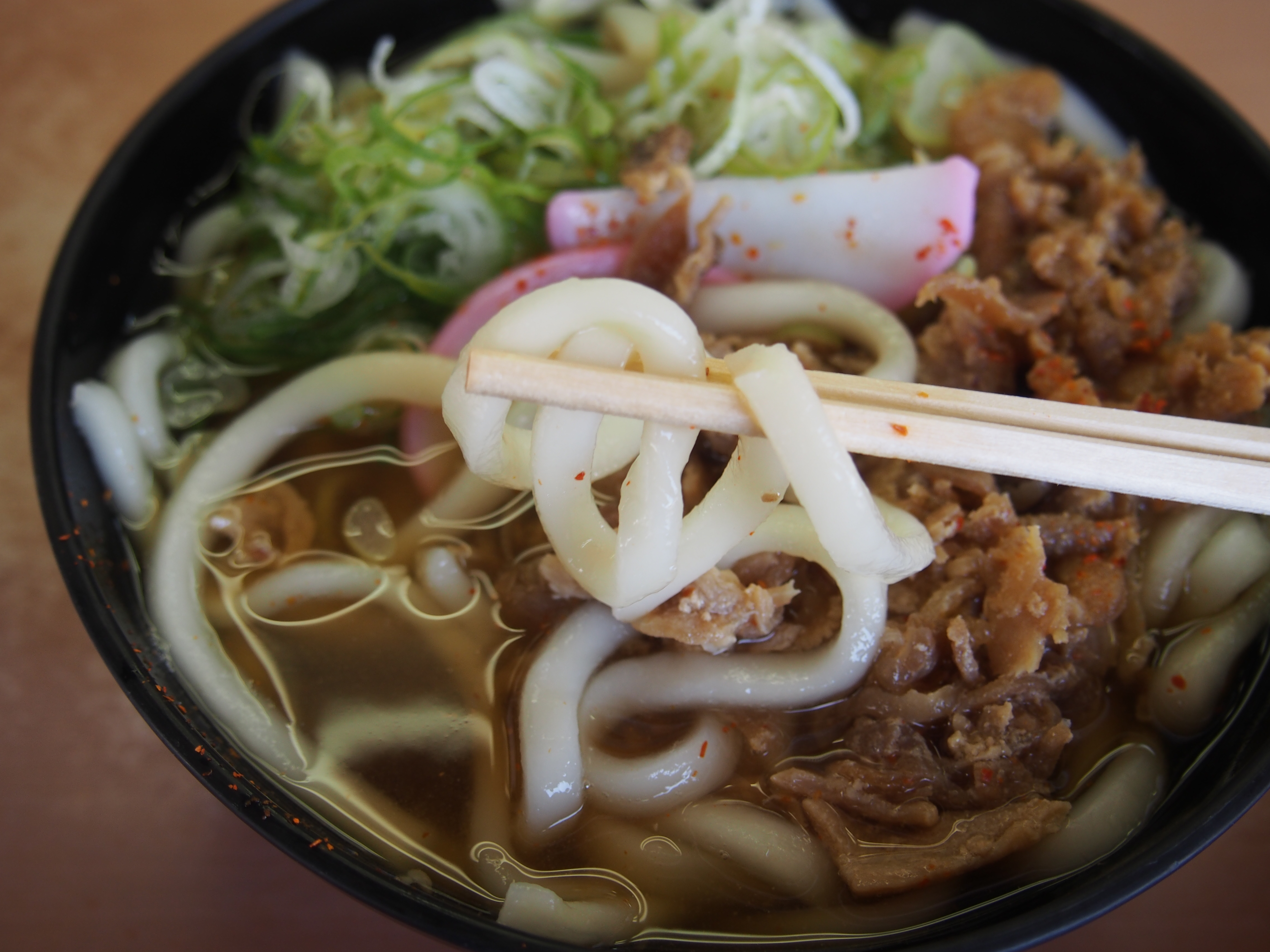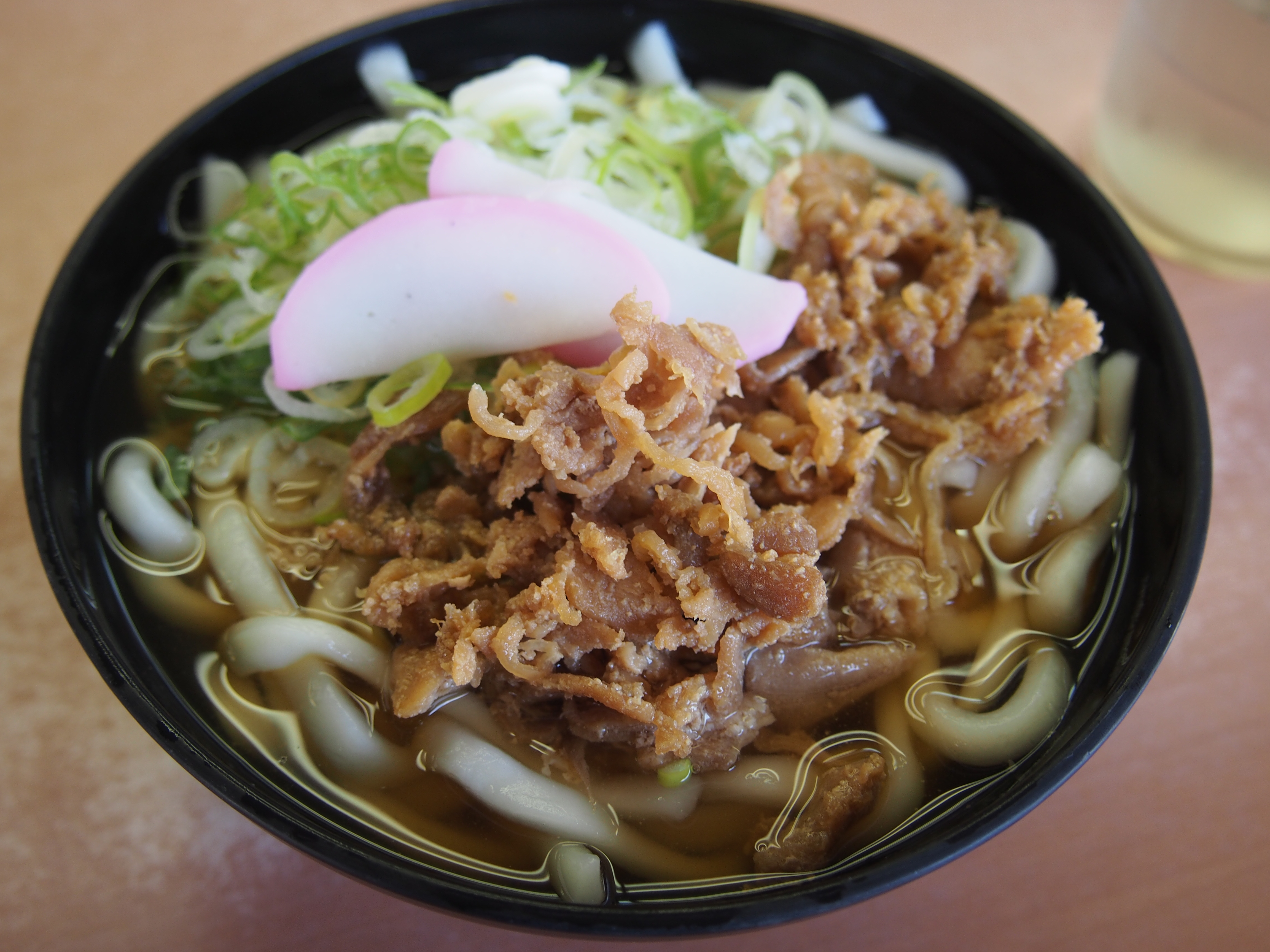 かしわうどんは、北九州の定番メニュー。鶏肉の出汁を使い、鶏肉(西日本の方言で「かしわ」)のそぼろがうどんの上に載っているのが特徴です。