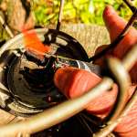 取り外しの仕方ですが、ハンドル部分と傘の部分を止める金具があります。写真の親指で触っている部分を左に動かします。逆にハンドルの左側部分の金具は右方向に動かします。これによって、蓋のロックがハズレるようになります。