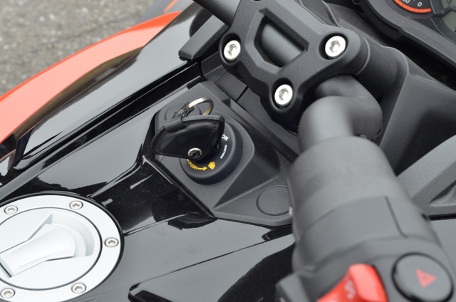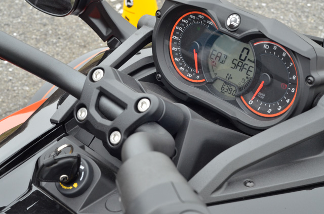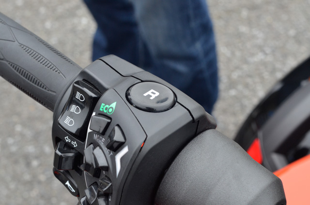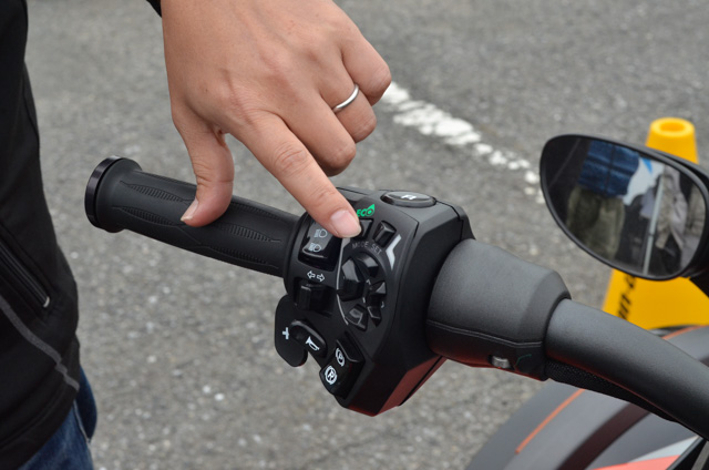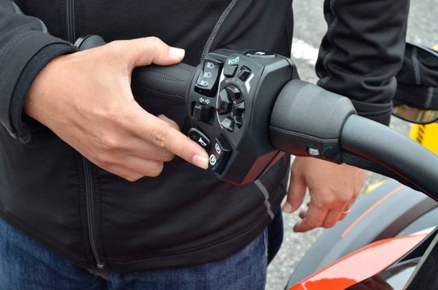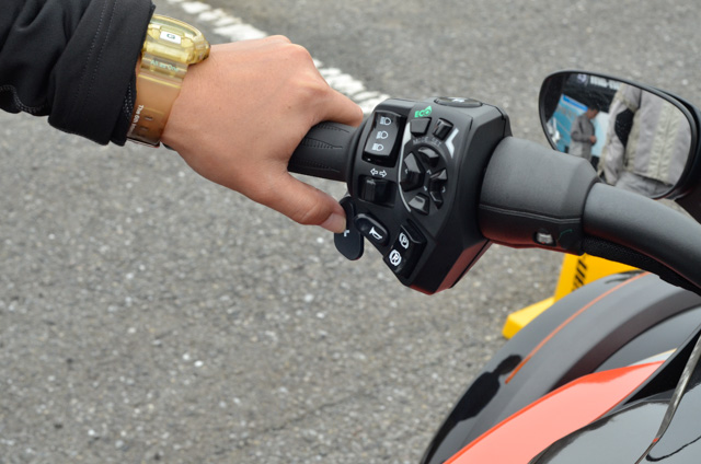 SPYDERには発進までの手順に約束事がある。イグニッションをONに回し、左グリップにあるモードスイッチを押してから、右グリップスターターボタンでセルを回す。このモードスイッチを押し忘れて「あれ? かからない…」ということがよくあるようだ。エンジンが息をしたら、パーキングブレーキ解除ボタンを押してからギアをローに入れる。